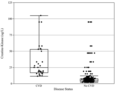 Figure 4. Boxplot of creatine-kinase (u/L) by cardio vascular disease (CVD) status.