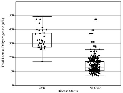 Figure 5. Boxplot of total lactase dehydrogenase (u/L) by cardio vascular disease (CVD) status.