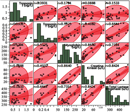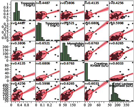 The suggested mechanisms that can link accelerated atheroscelerosis and increased cardiovascular risk in subjects with diabetes are still poorly understood. It has been noted that an association between hyperglycemia and epigenetic factors by different types of reactions could be responsible for the interaction between genes and environment and for this reason account for the association between diabetes and cardiovascular disease [34] . The boxplot in this study result analysis (Figures 1-5) has shown the distribution of the different measured parameters variability by cardiovascular diseases. There’s a very positive correlation (Figure 6 and Figure 7) which indicate that there’s a relationship between the cardiac markers parameters in chronic diabetes with cardiovascular diseases.