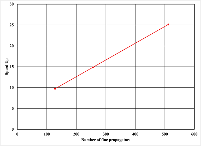 resulting in a speedup of 25×. The PRA on GPU provides better performance when the fine propagator computation load is large, i.e. smaller