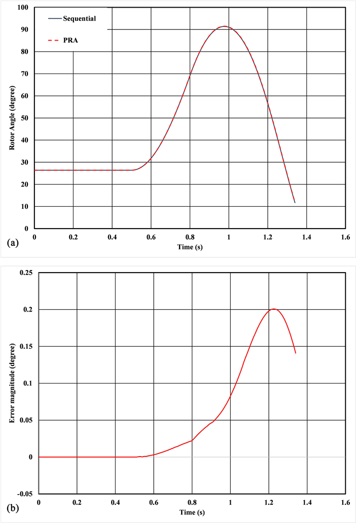 Figure 6. Rotor Angle Variation using Sequential and PRA of Classical Generator Model. (a) Rotor Angle variation with Sequential and PRA Simulations; (b) Rotor Angle Variation Error with PRA Simulations.