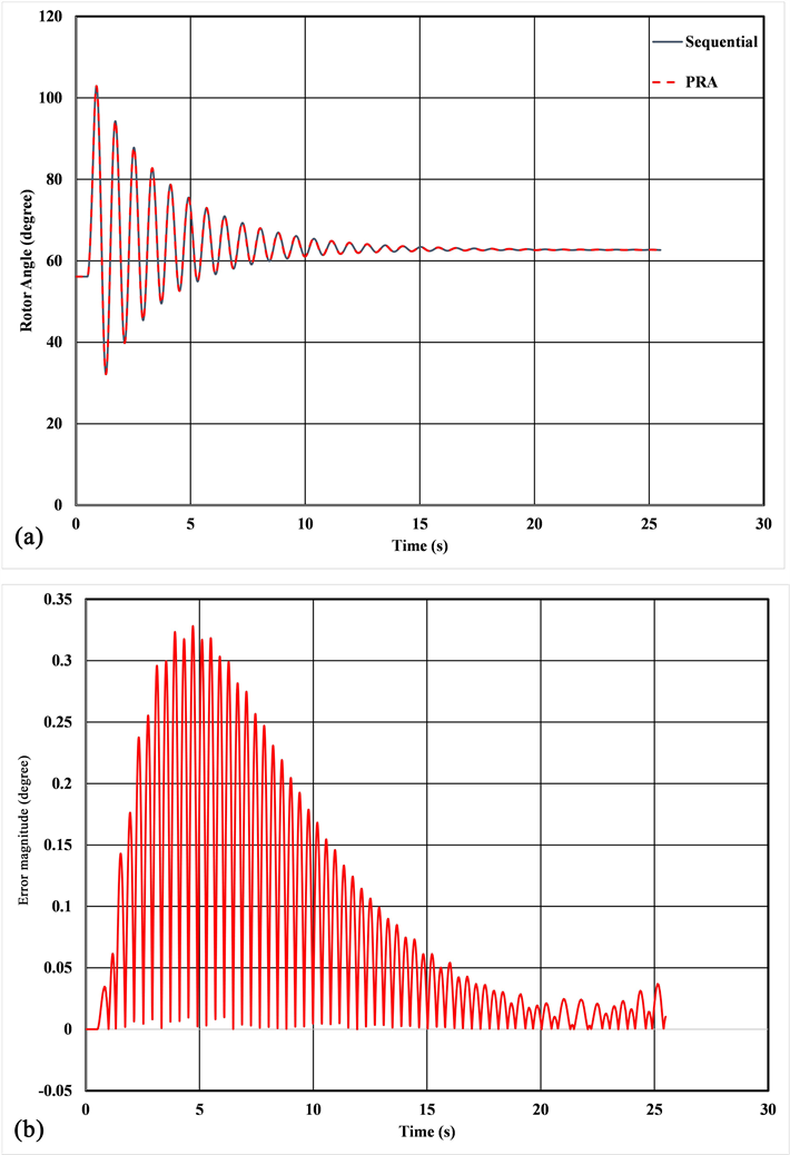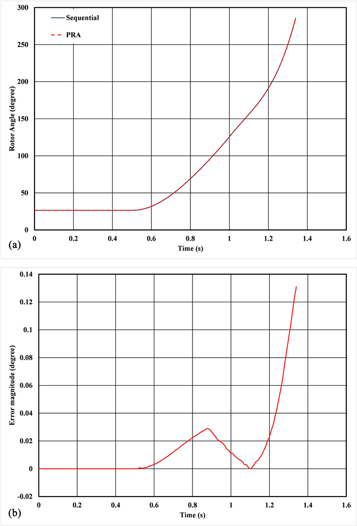 In Figure 8(a), the rotor angle variations with sequential and PRA simulations are presented. The rotor angle solutions computed using the PRA is similar to the traditional sequential method. Also, it can be noticed that the rotor angle swing is damped and settles to a new system steady-state. In Figure 8(b), the rotor angle absolute error between the sequential and the PRA simulations is presented. The rotor angle computation with the detailed model involves the sequential solution of four ODEs at each time step and application of the predictor-corrector on all four ODEs at the end of each fine propagator iteration. The numerical values of the solutions of the four ODEs during the initial phase of fault are large. These numerical large values cascade through the four ODEs within a fine propagator iteration and due to the cascading effect, the numerical error is large initially as shown in Figure 8(b). After the clearing of the fault, and due to damping the rotor angle swing reduces and correspondingly the numerical values resulting in smaller numerical error between the sequential and PRA simulations.