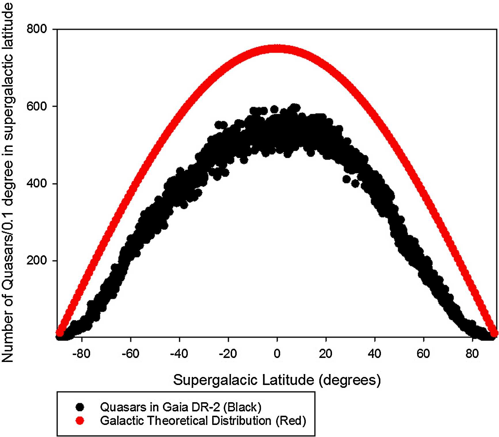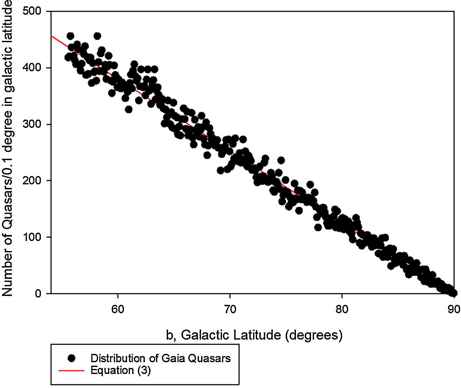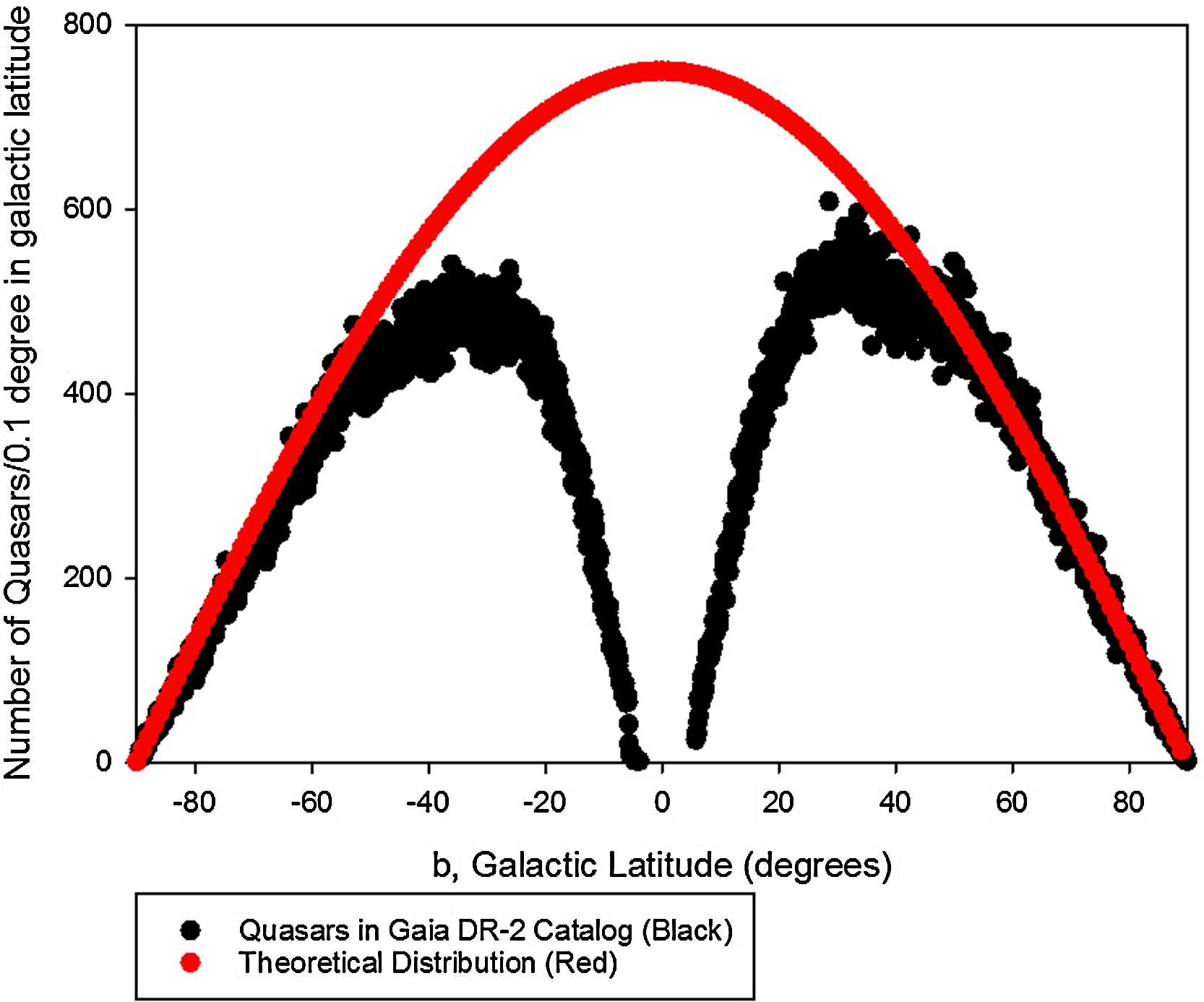 Depicted in Figure 3 is the quasar distribution as a function of galactic latitude, b, according to Gaia observations. The black filled circles in Figure 3 show the distribution of 555,934 quasars from DR-2 (Brown et al. [55], Andrae et al. [45], Arenou et al. [56]). Dominant is galactic extinction, which leads to no quasars on the galactic equator. Thus, the theoretical curve will not match observations,