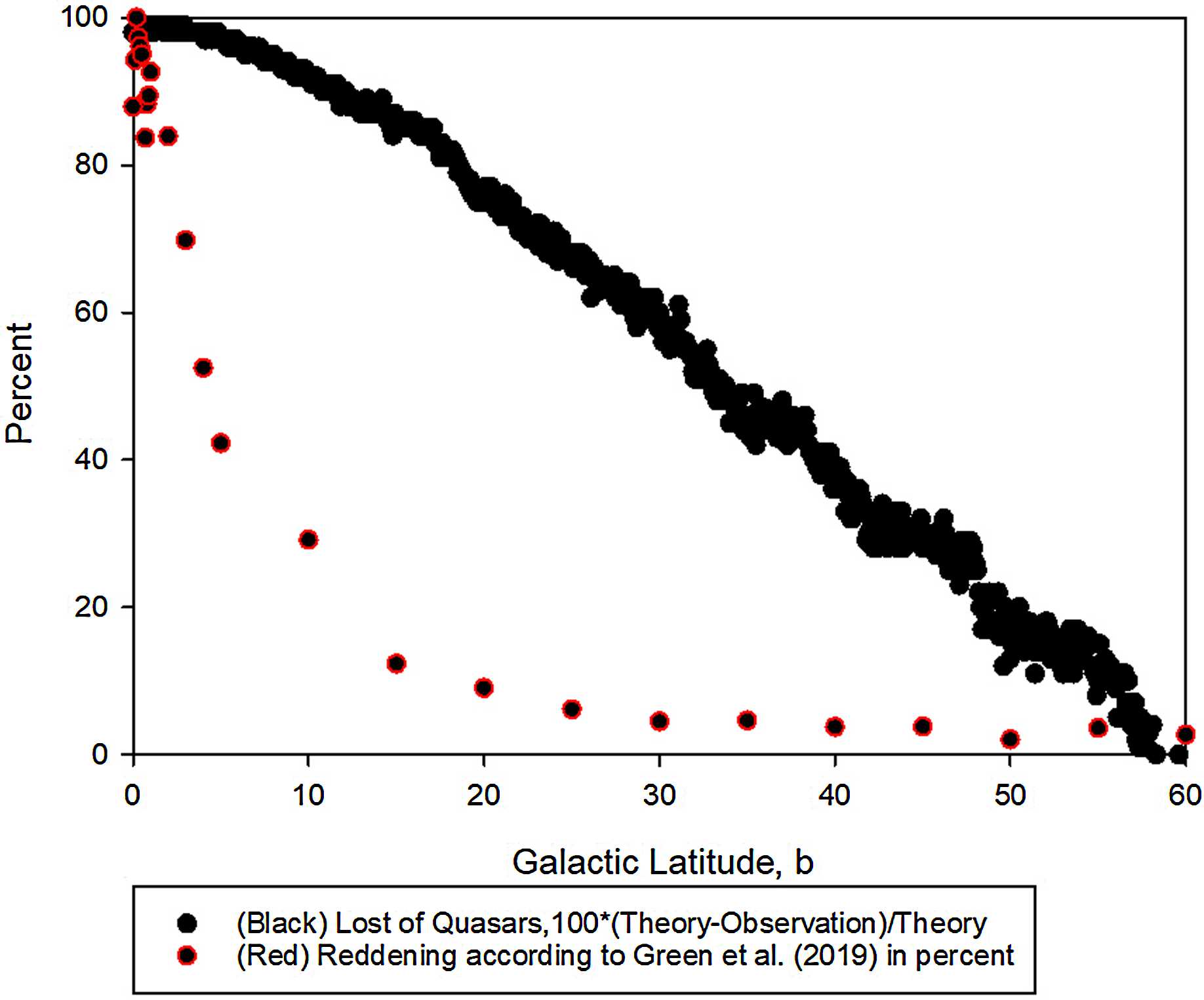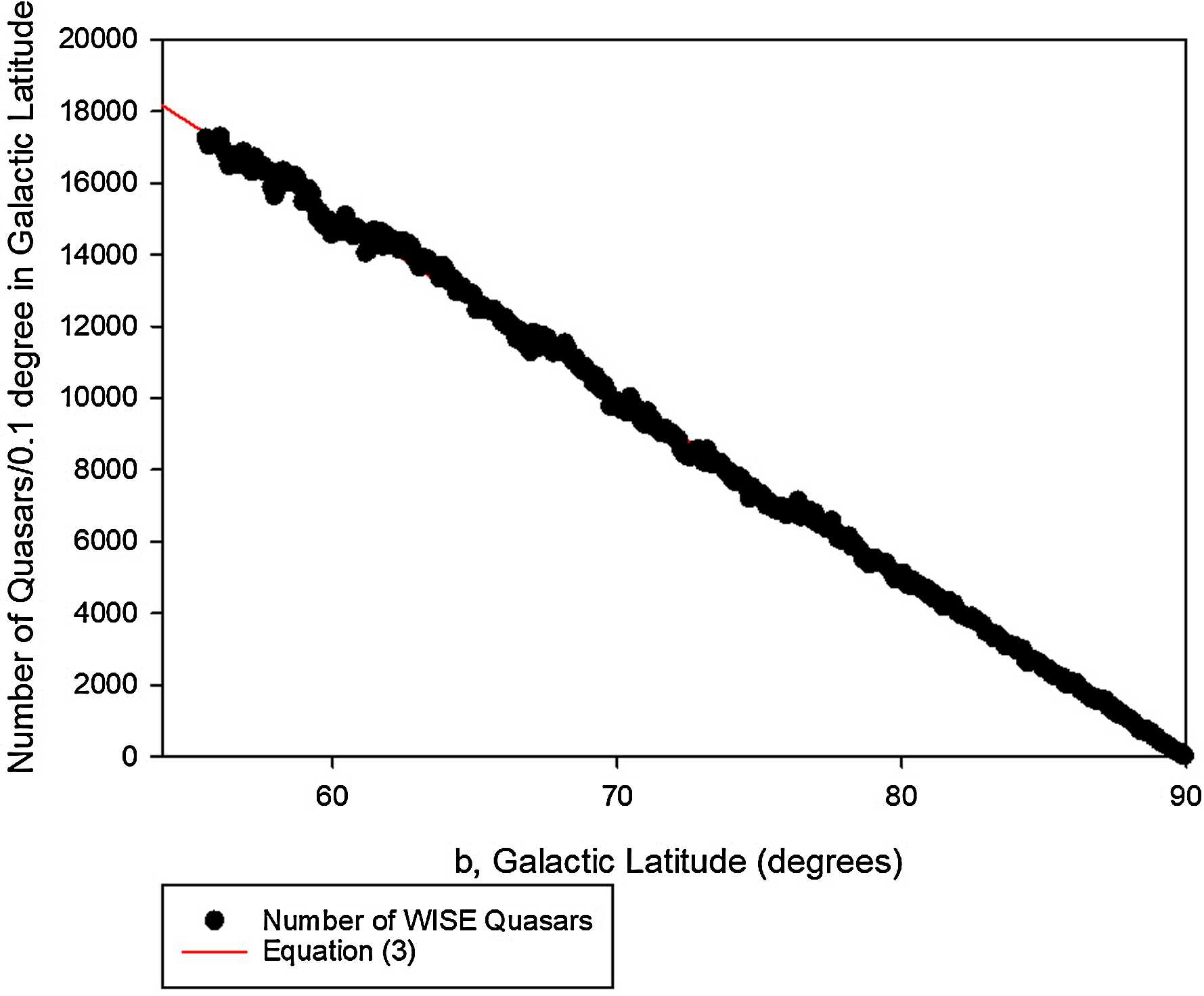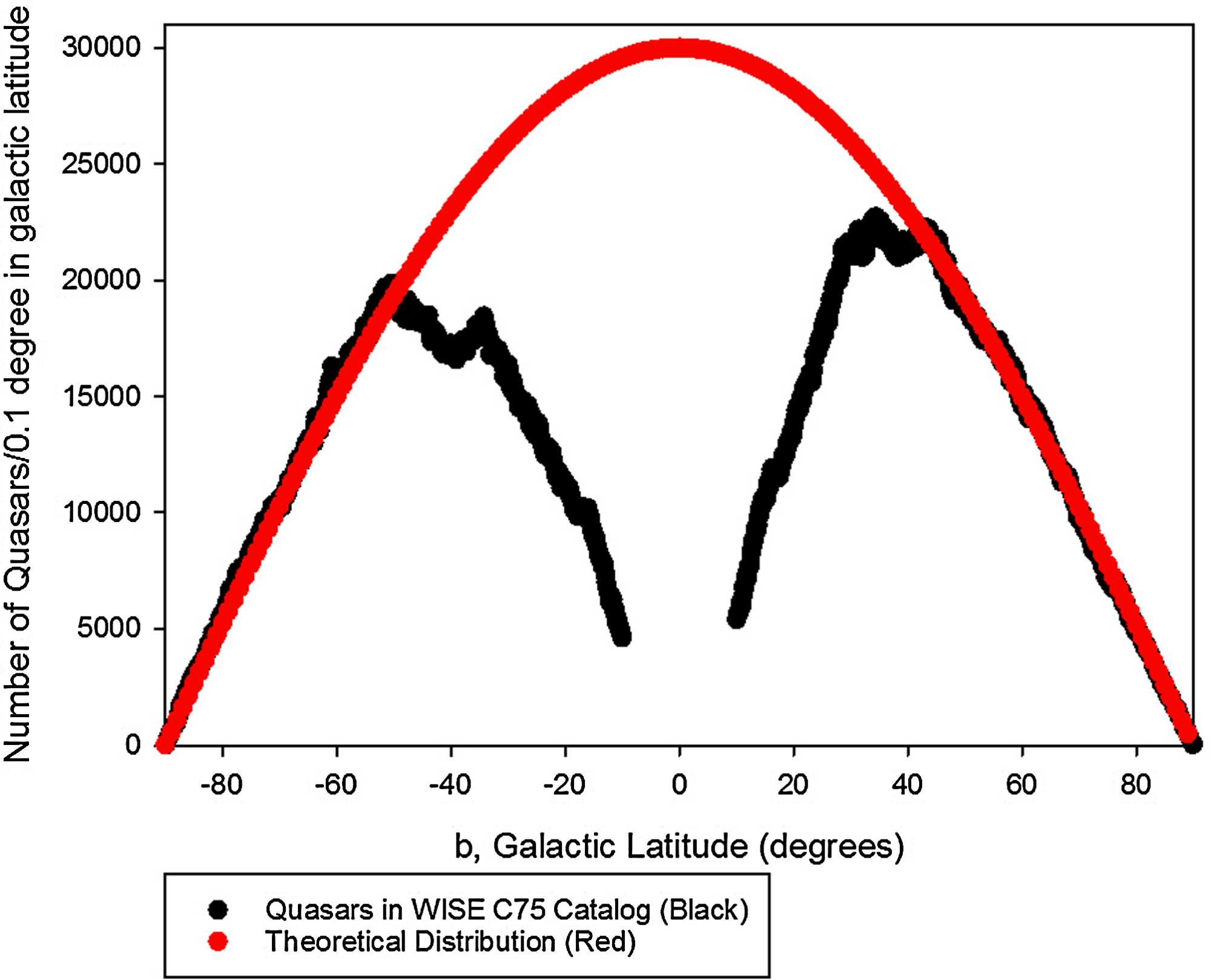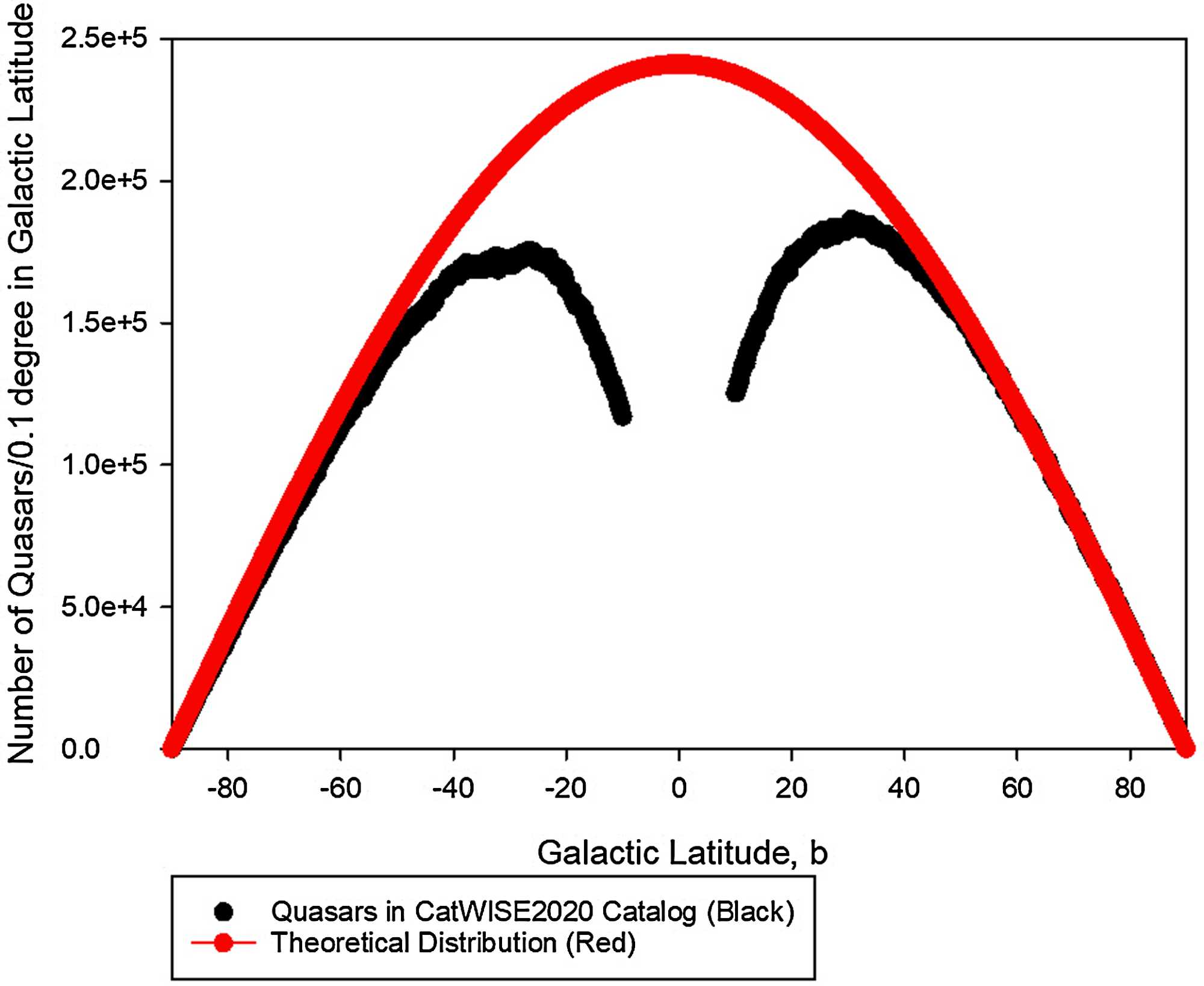 Depicted in Figure 3 is the quasar distribution as a function of galactic latitude, b, according to Gaia observations. The black filled circles in Figure 3 show the distribution of 555,934 quasars from DR-2 (Brown et al. [55], Andrae et al. [45], Arenou et al. [56]). Dominant is galactic extinction, which leads to no quasars on the galactic equator. Thus, the theoretical curve will not match observations,