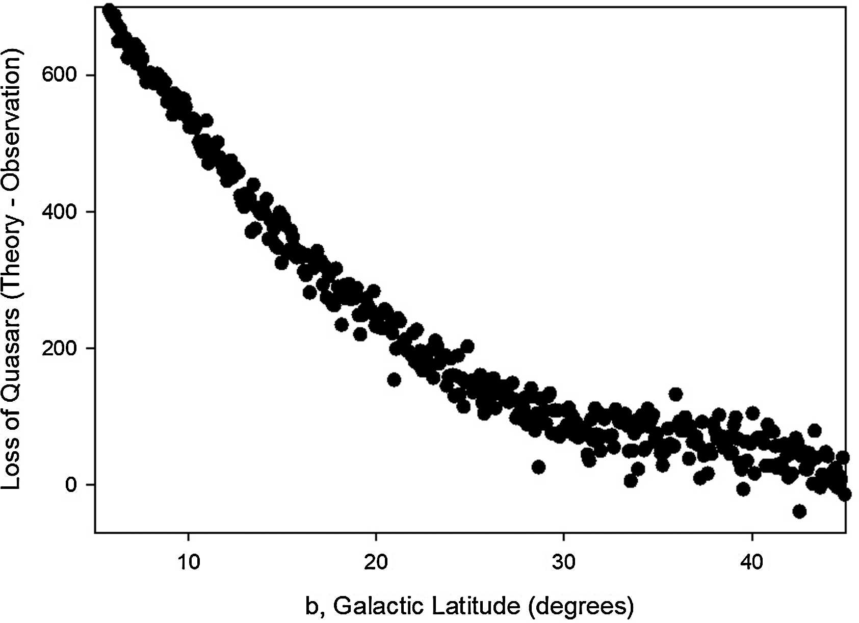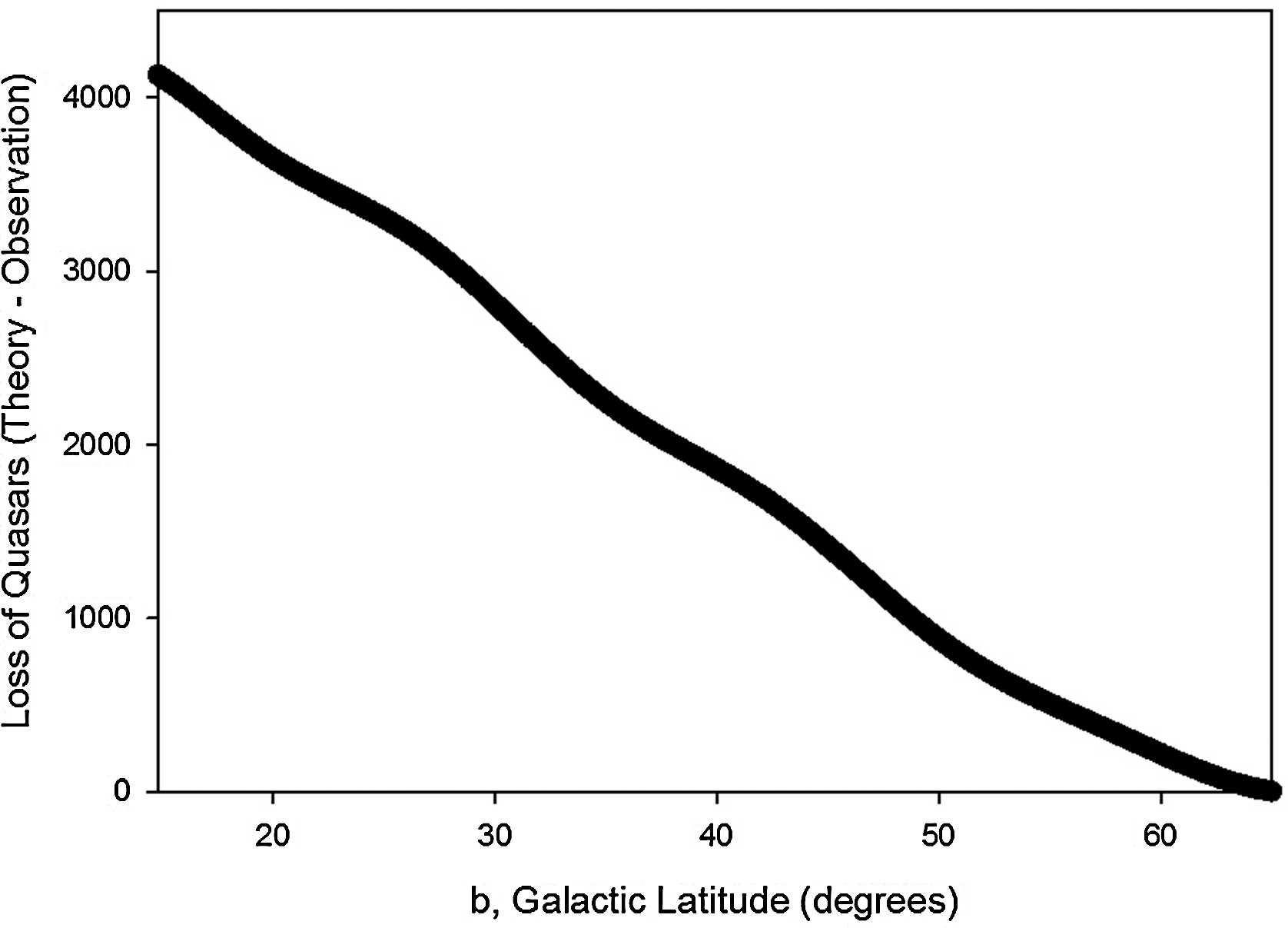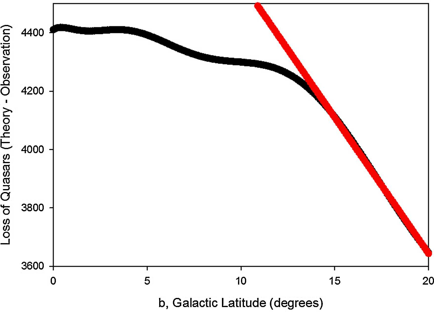 confirmed through a visual inspection of Figure 2, which shows the lost of quasars in the SDSS catalog as a function of galactic latitude. Figure 13 shows the loss of quasars in the range: