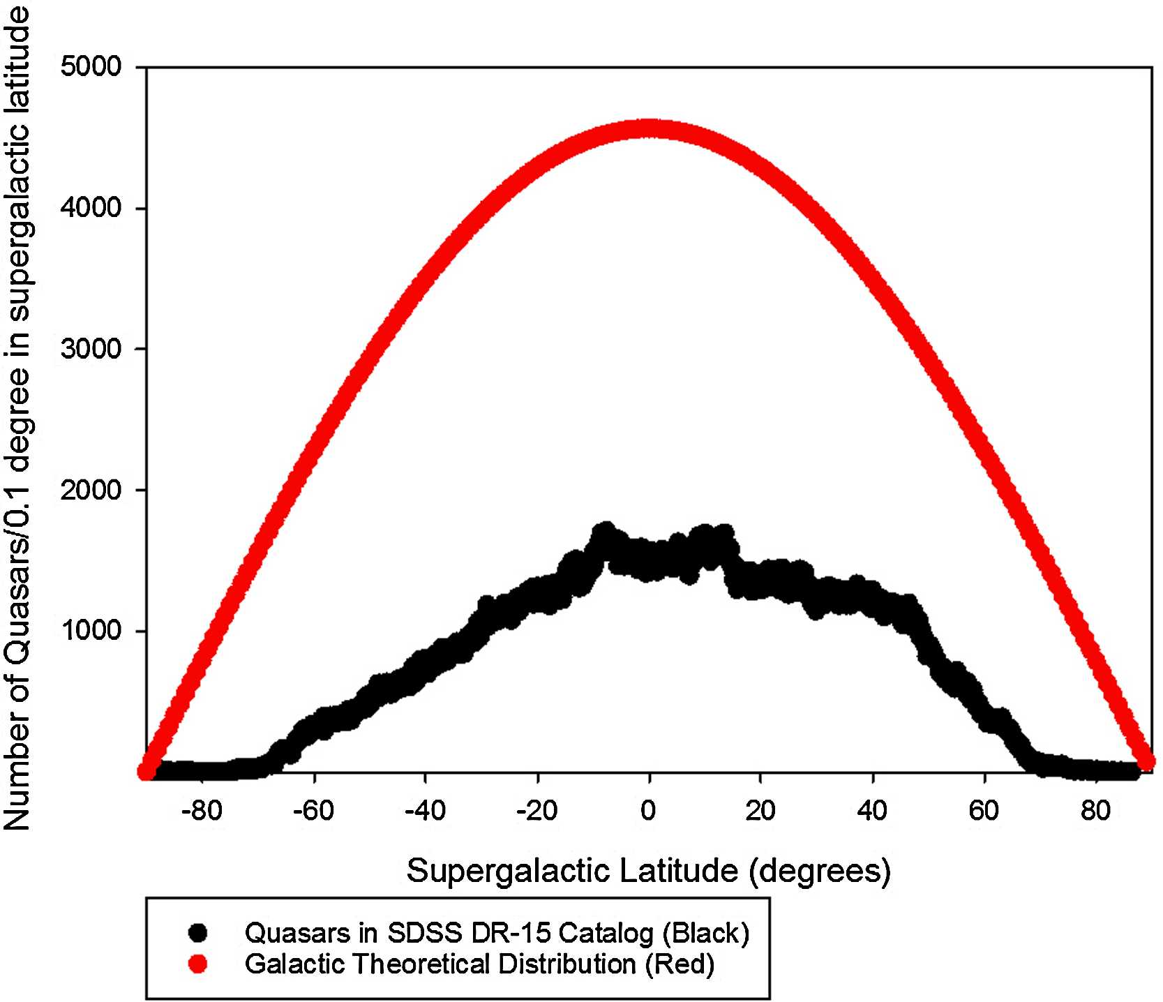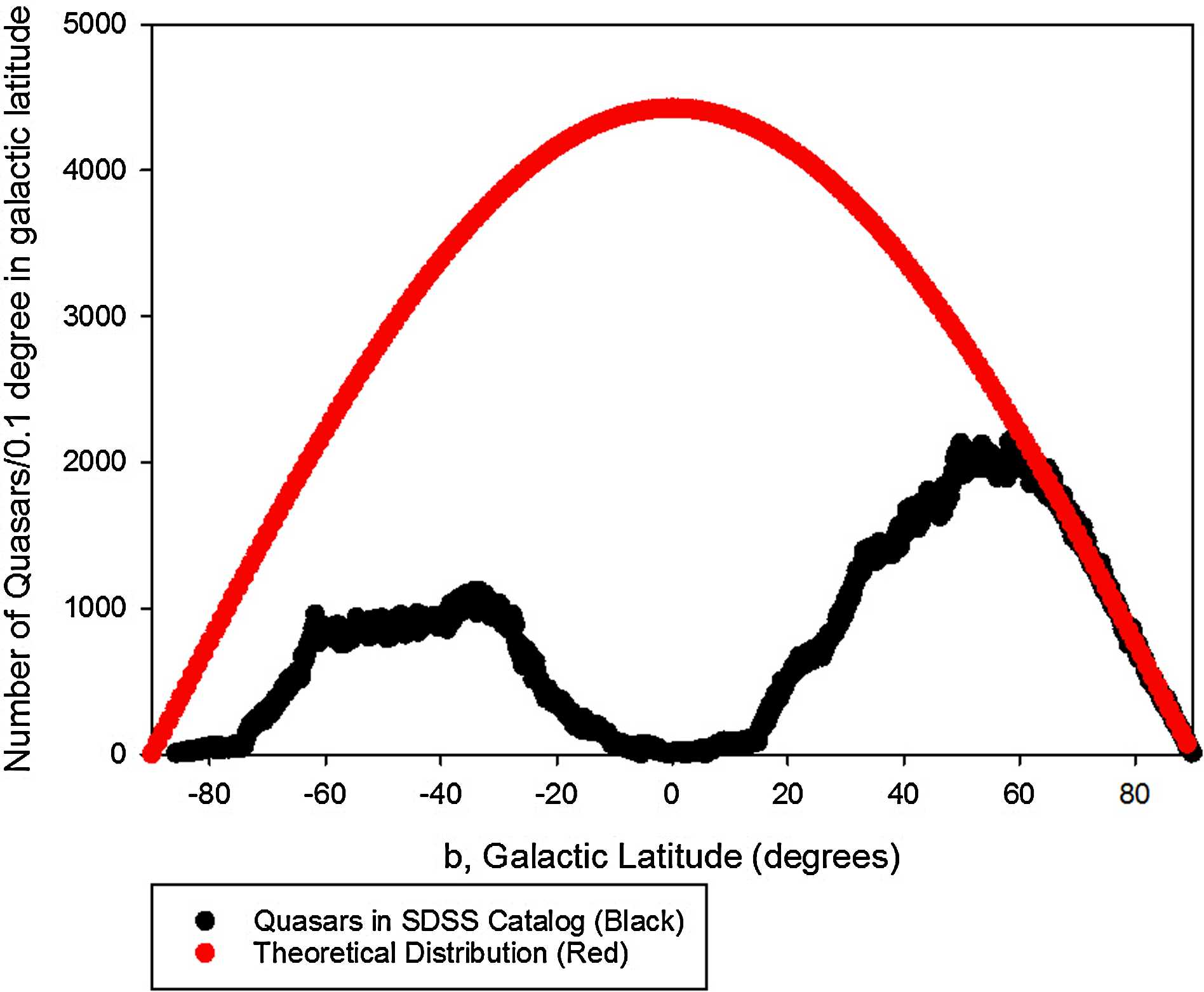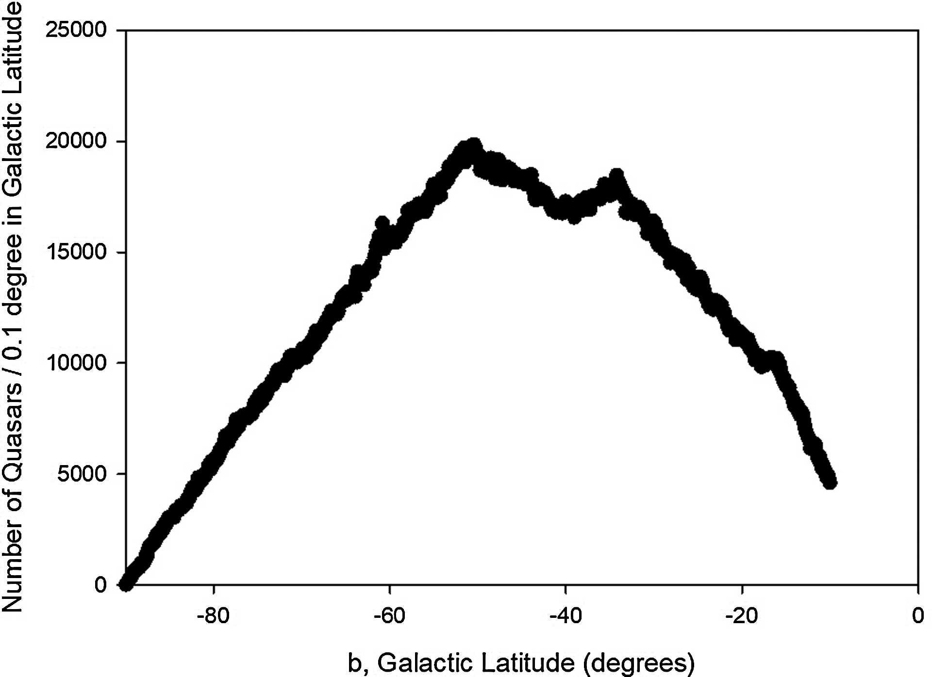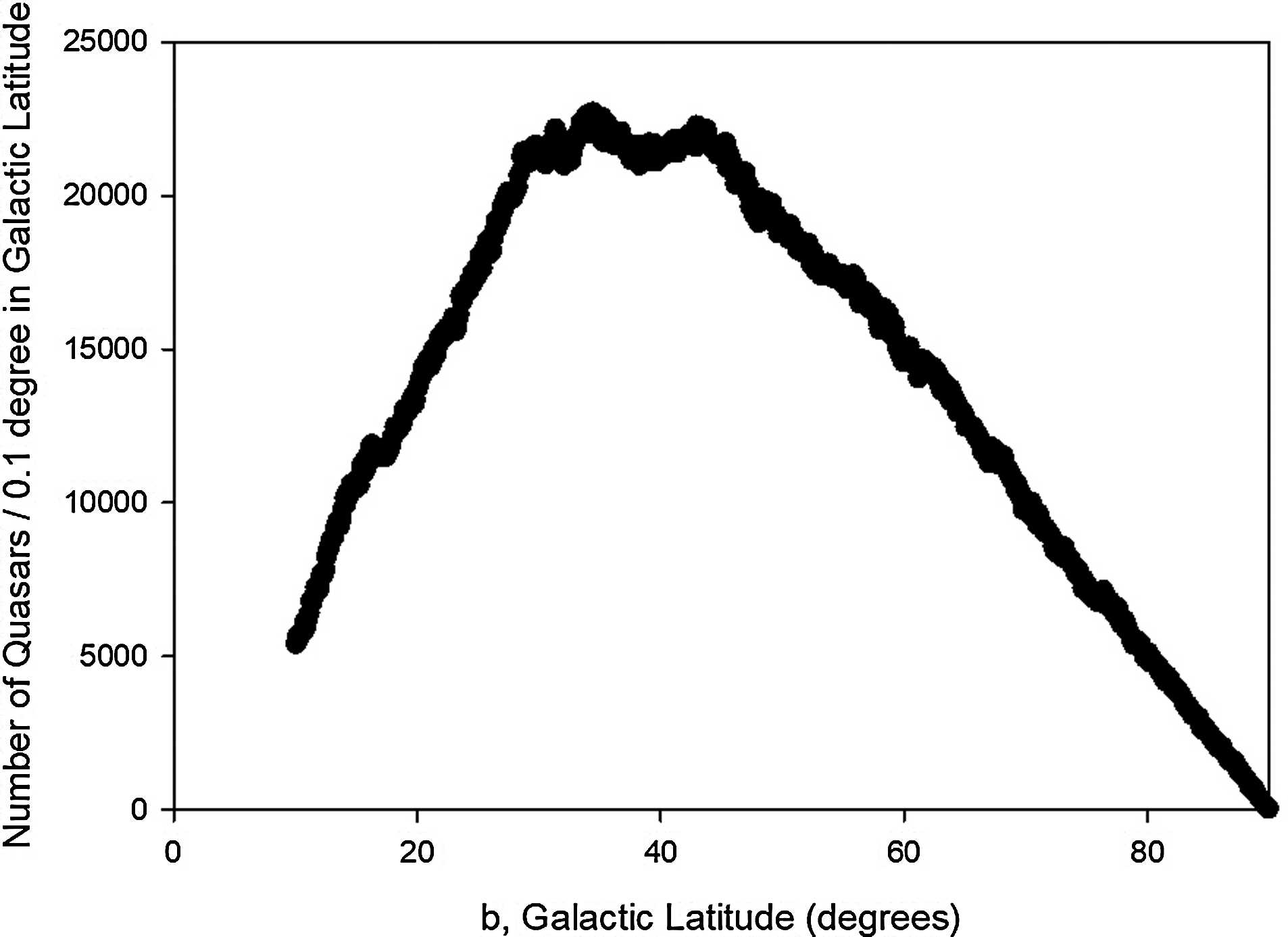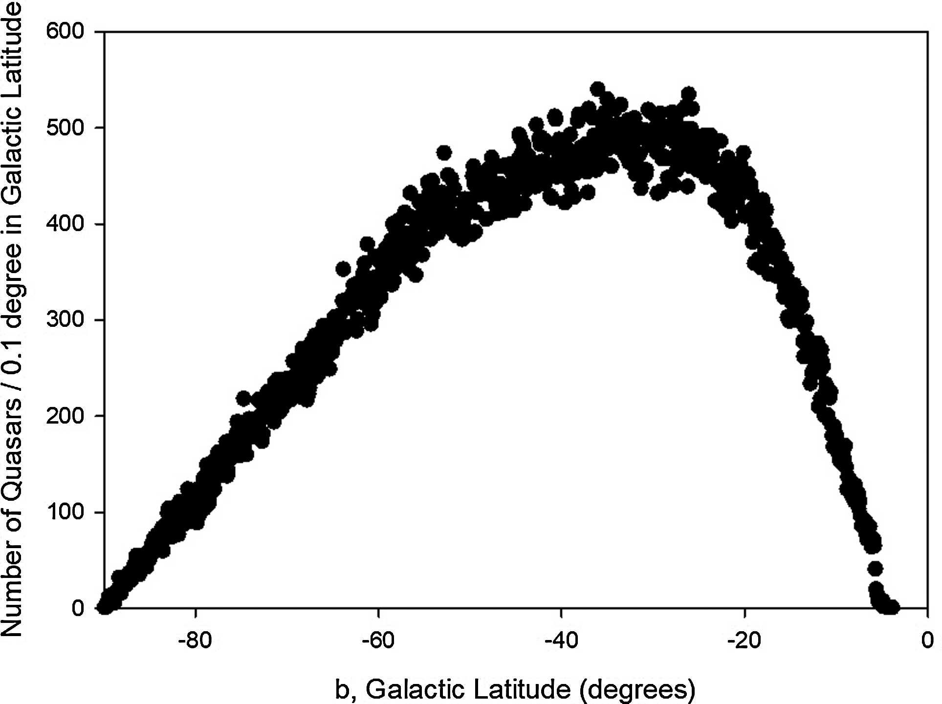 The black filled circles in Figure 2 show the distribution of the quasars from the Sloan Digital Sky Survey (SDSS) as a function of galactic latitude, b.