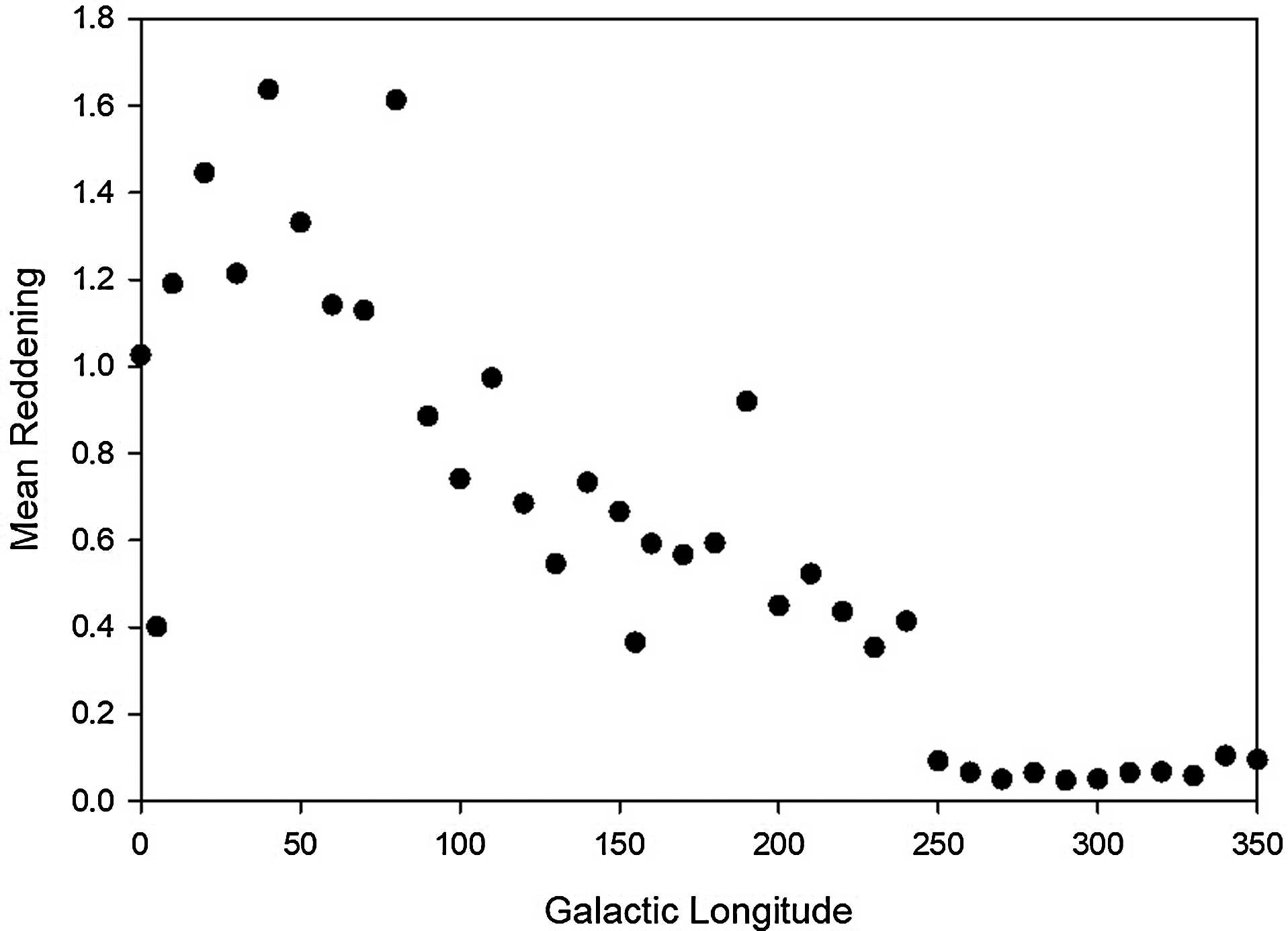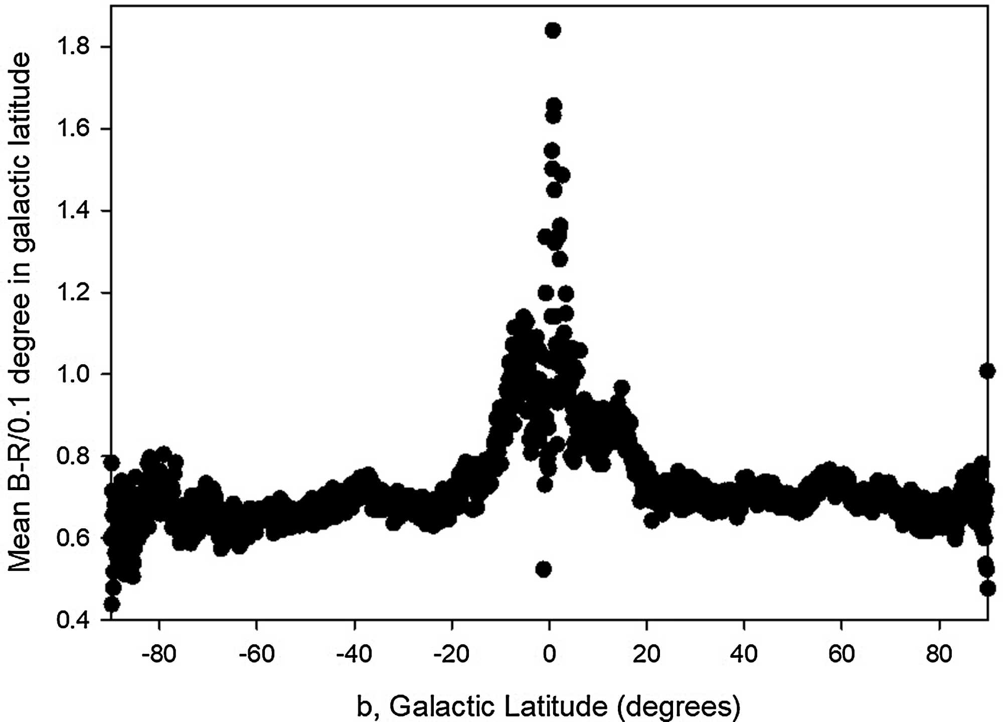 In Figure 4 we see the data (filled black circles) from the C75 catalog as a function of galactic latitude, b. As we look toward the galactic center at