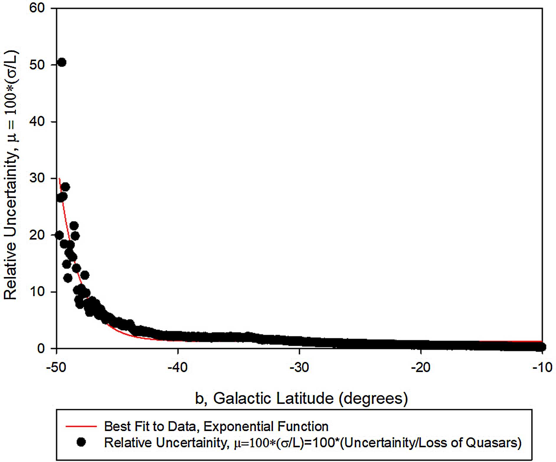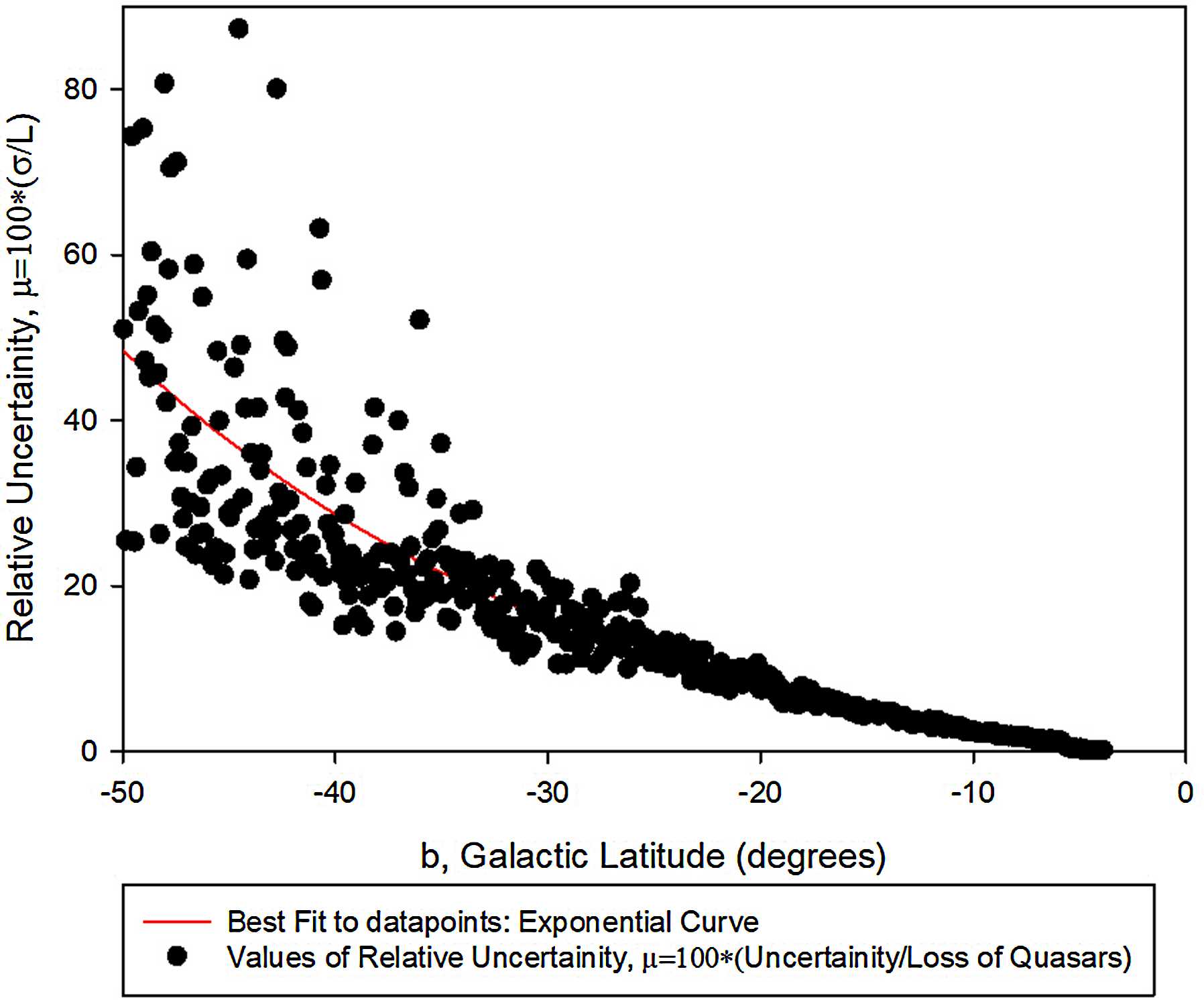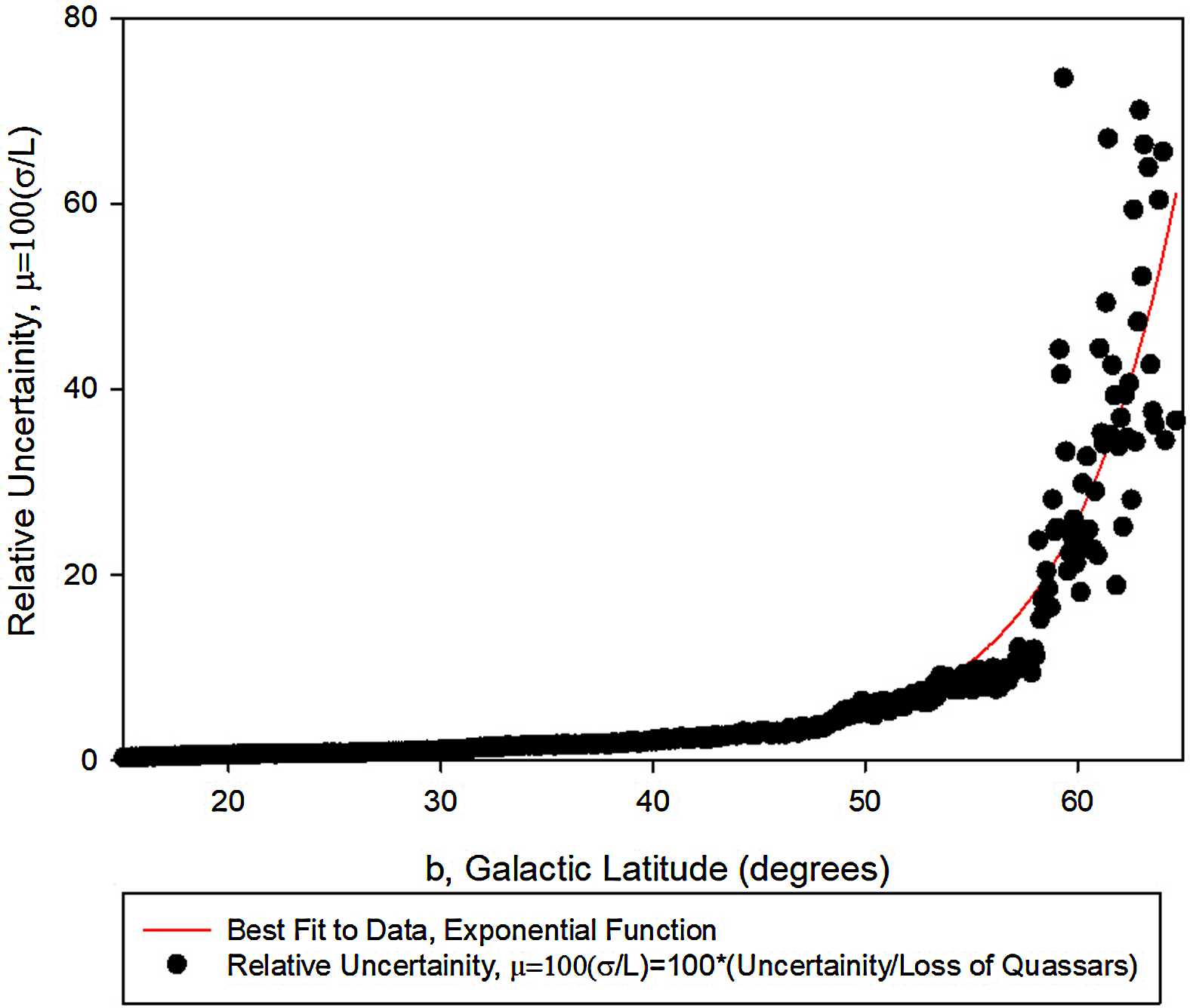 In order to provide the statistical justification it is necessary to quantify the uncertainty of the number of quasars in each bin. It is appropriate to assume the applicability of the Poisson distribution because it is generally employed to give the statistical uncertainty of a given number of events, which occur in a fixed interval of time or space. The statistical uncertainty is given simply by the square root of the number of measured events, that is in our case the number of quasars in each bin, with a bin size of 0.1˚. If the uncertainly, σ, that is the square root of the number of quasars in each bin, is significantly smaller than the difference between theory and observation, that is the loss of quasars L, then our approach of subtracting observation from theory is statistically justified. We introduce the relative uncertainty, μ. In terms of percentage we have: