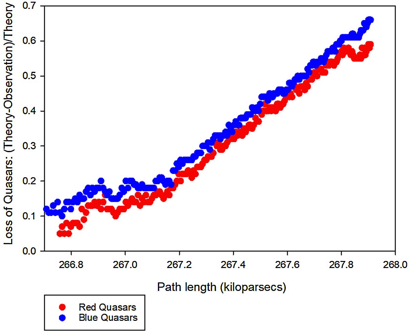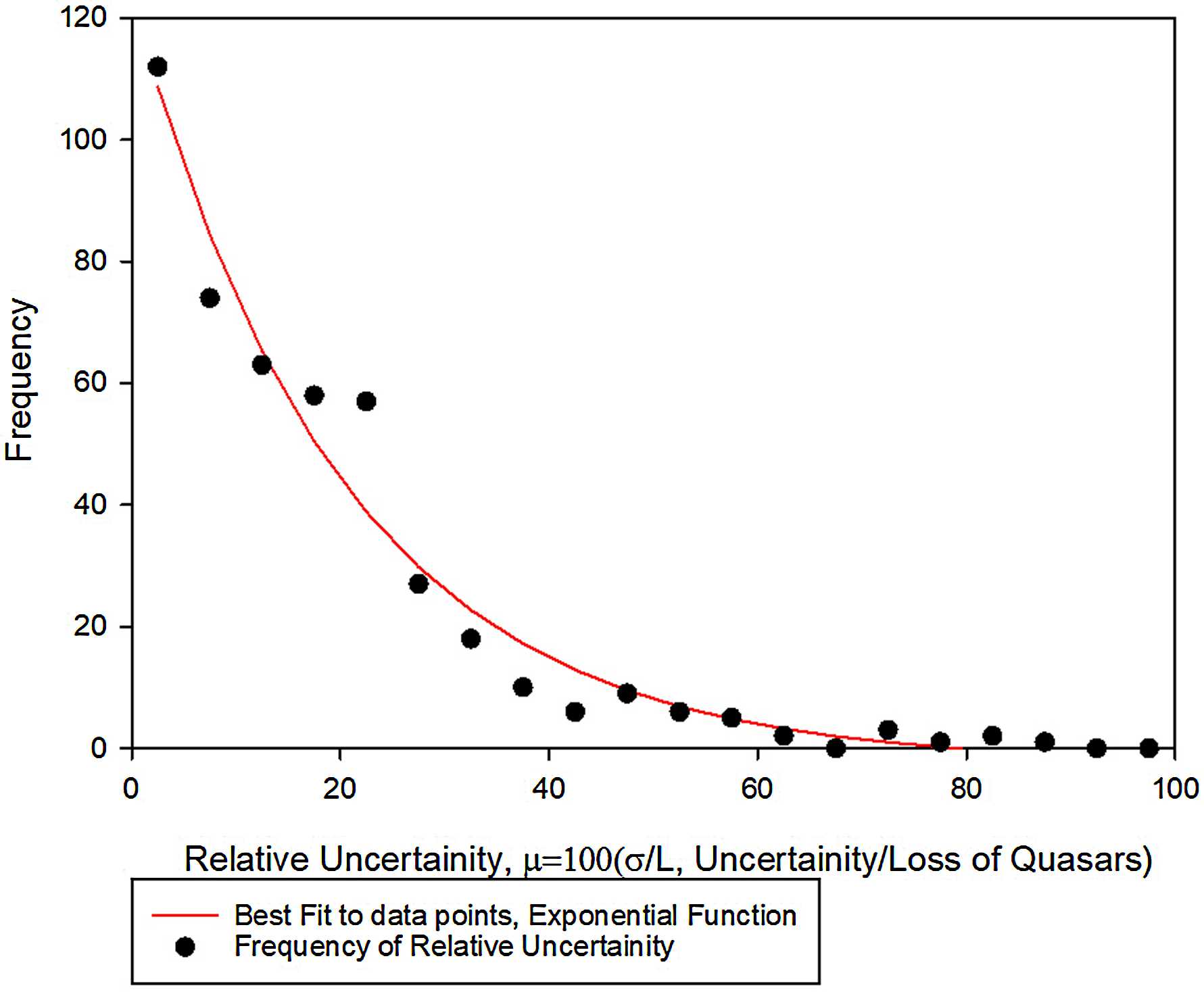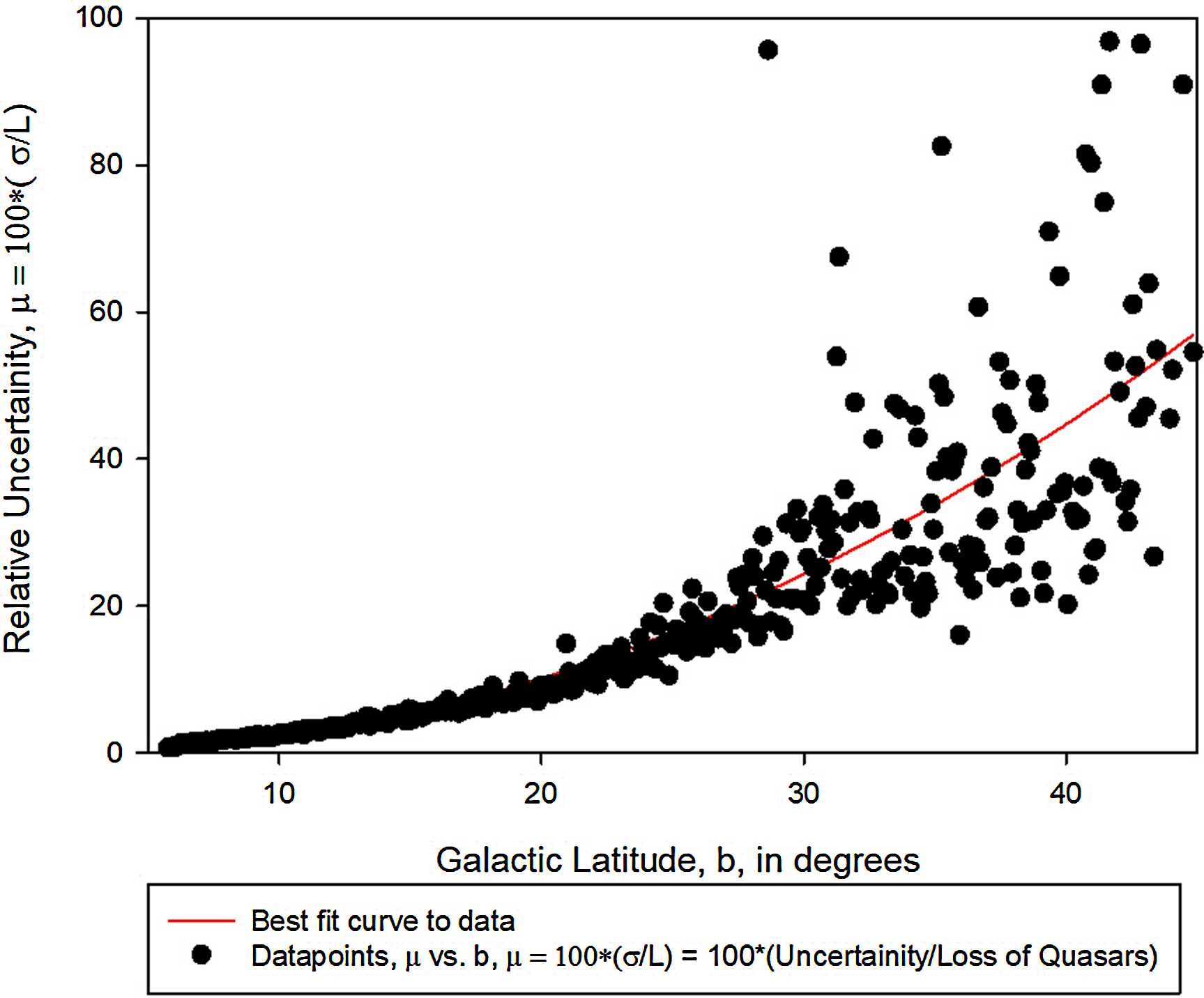 In order to provide the statistical justification it is necessary to quantify the uncertainty of the number of quasars in each bin. It is appropriate to assume the applicability of the Poisson distribution because it is generally employed to give the statistical uncertainty of a given number of events, which occur in a fixed interval of time or space. The statistical uncertainty is given simply by the square root of the number of measured events, that is in our case the number of quasars in each bin, with a bin size of 0.1˚. If the uncertainly, σ, that is the square root of the number of quasars in each bin, is significantly smaller than the difference between theory and observation, that is the loss of quasars L, then our approach of subtracting observation from theory is statistically justified. We introduce the relative uncertainty, μ. In terms of percentage we have: