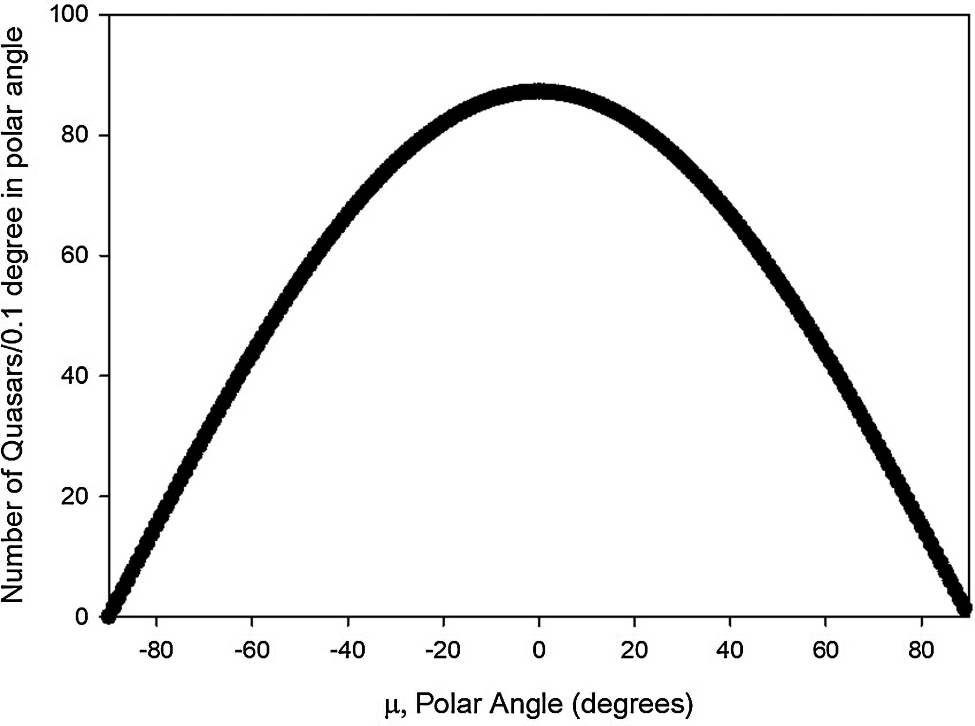 where μ is the polar angle and ν, the azimuthal angle. Integration over the entire sphere gives n, which is the total number of quasars in the sample. Equation (1) applies to the general case of an anisotropic distribution. The anisotropy is described mathematically via the function,