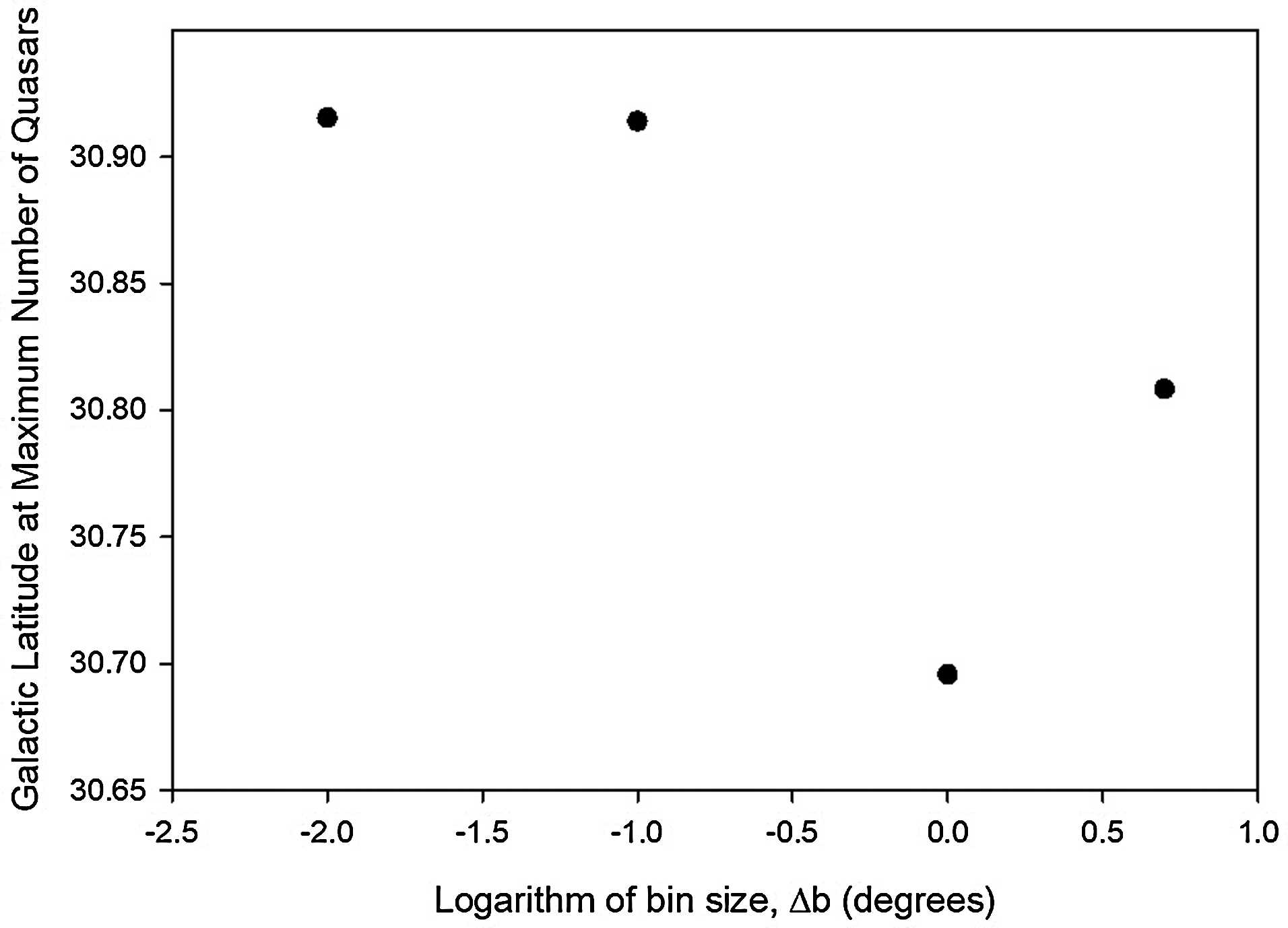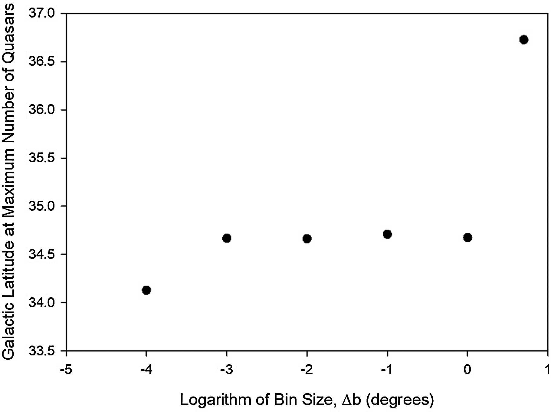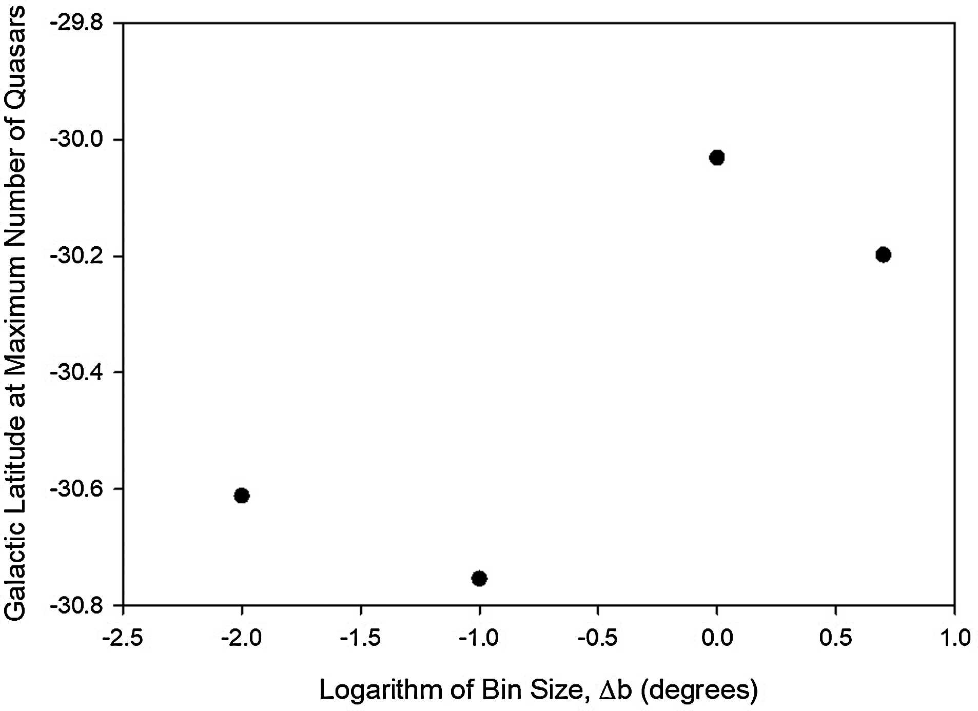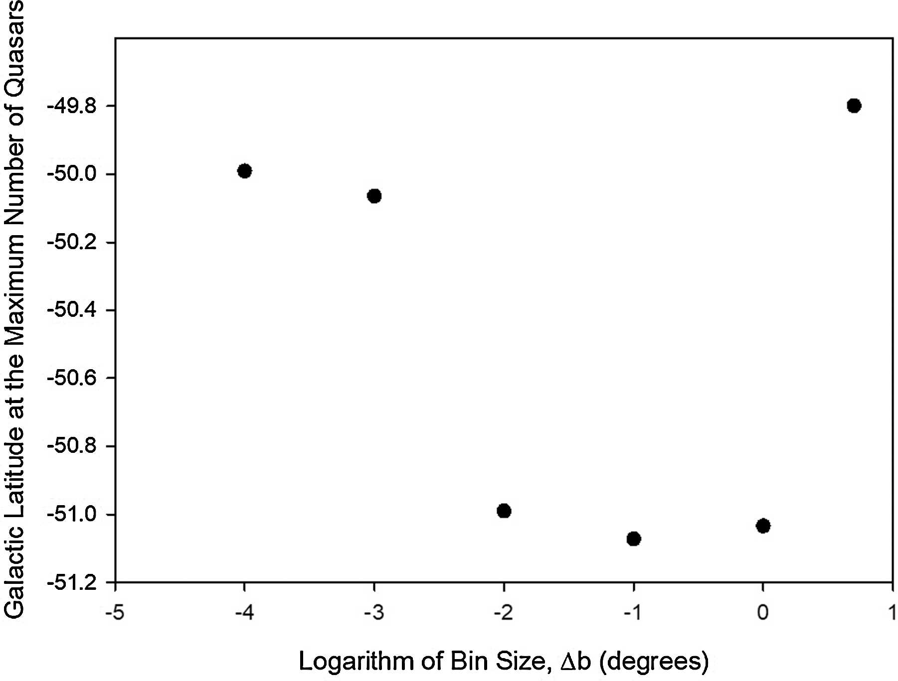 caused by dust initiates. Accurate values of these peaks taking into account the dependency on bin size are computed in Appendix A. This latter behavior is not exhibited in the SDSS dataset due to the lack of observations in the southern hemisphere. These features of the observed distributions of quasars on the celestial sphere are crucial because they will lead us to the conclusions drawn in the final section of this publication.
