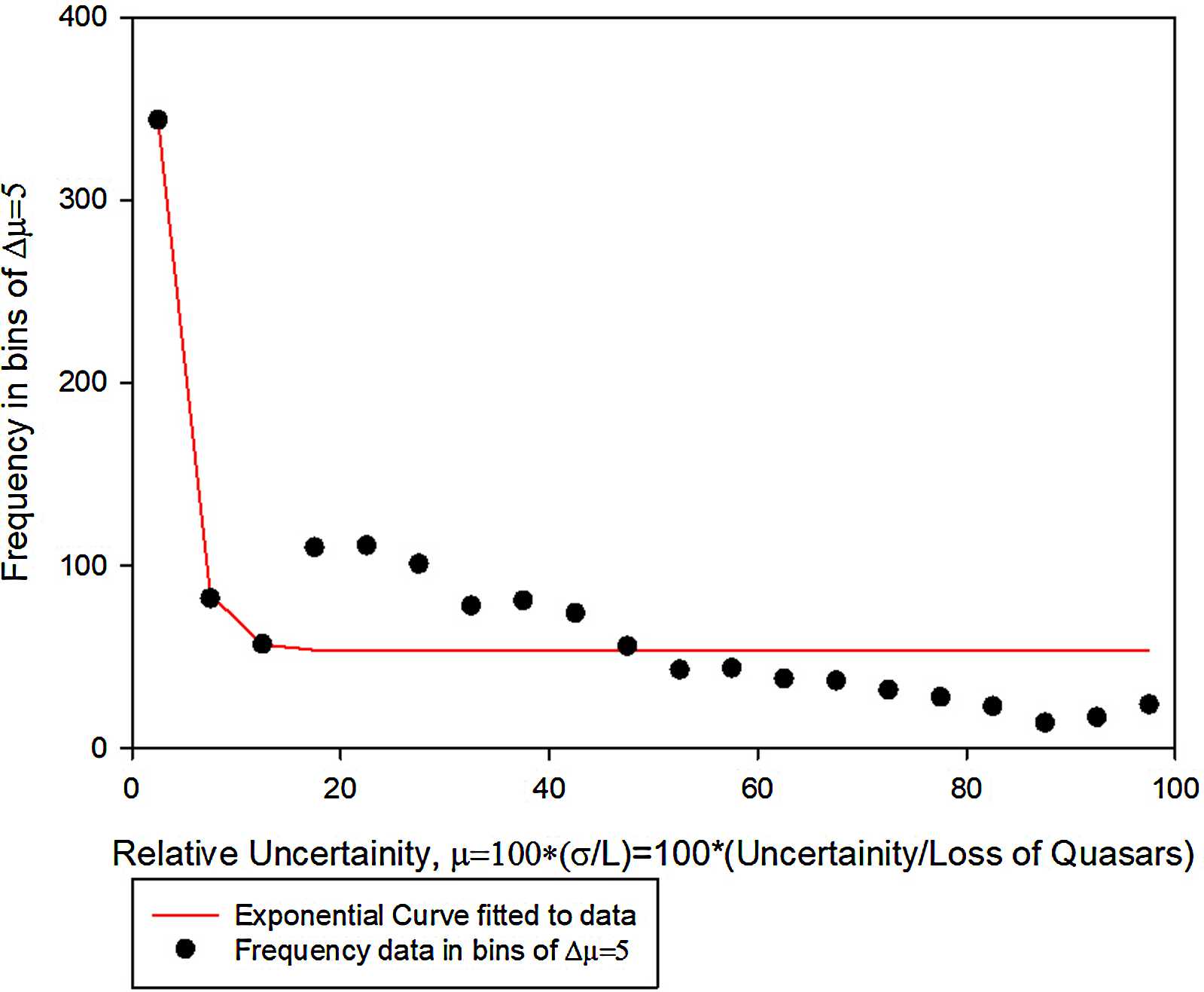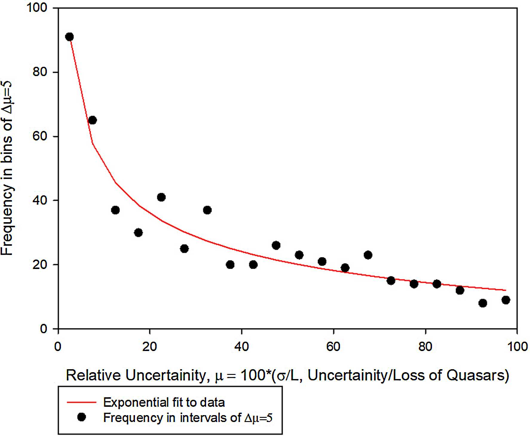 statistically justified. There is however a major drawback in employing the concept of relative uncertainty, μ. It is inversely proportional to L, the loss of quasars, meaning that when L is small μ can become large even though the uncertainty, σ may be small too. In fact 6% of the data points in the range,