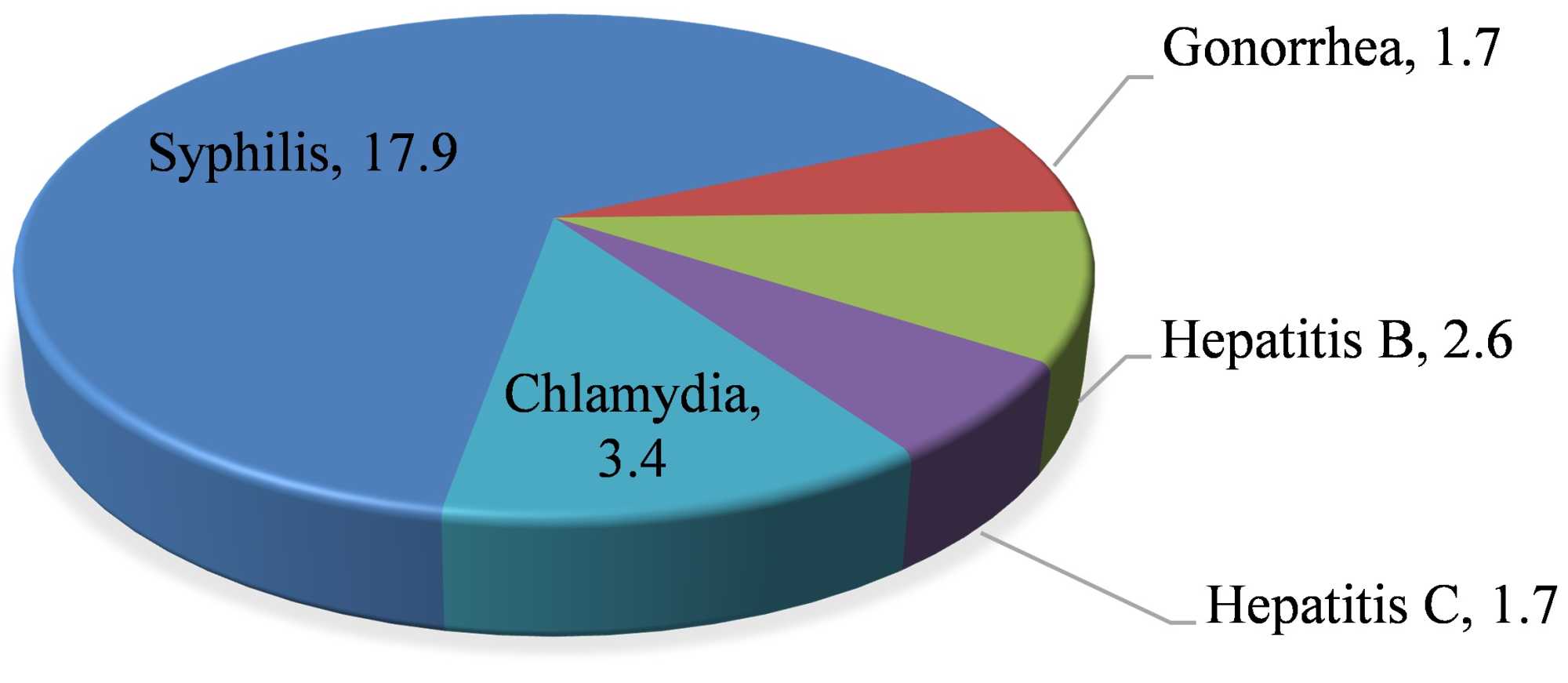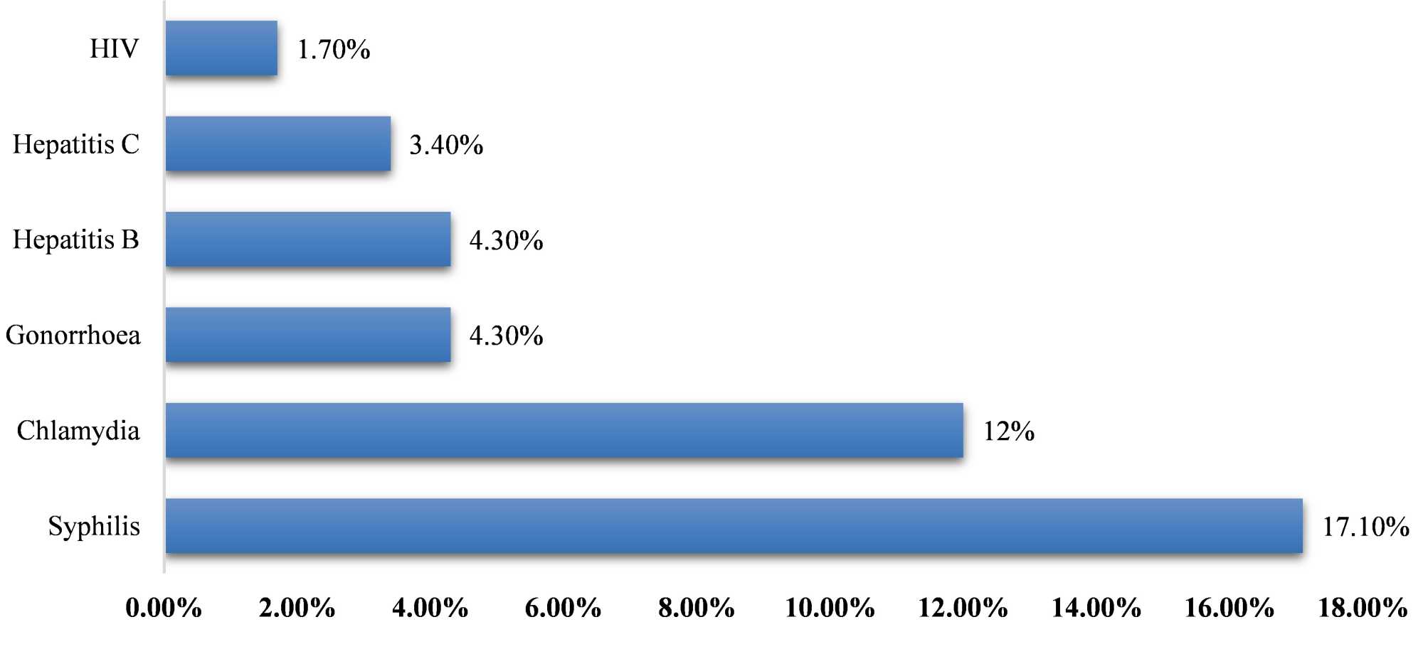 Figure 2 presents the prevalence of the sexually transmitted infections (STI) in the study population. The highest infection rate observed was for syphilis, with 17.1% testing positive. This was followed by chlamydia (12%), also showing a relatively high prevalence. Gonorrhea and hepatitis B each had a prevalence of 4.3%, while hepatitis C was found in 3.4% of participants. The lowest prevalence was seen in HIV, with only 1.7% testing positive.