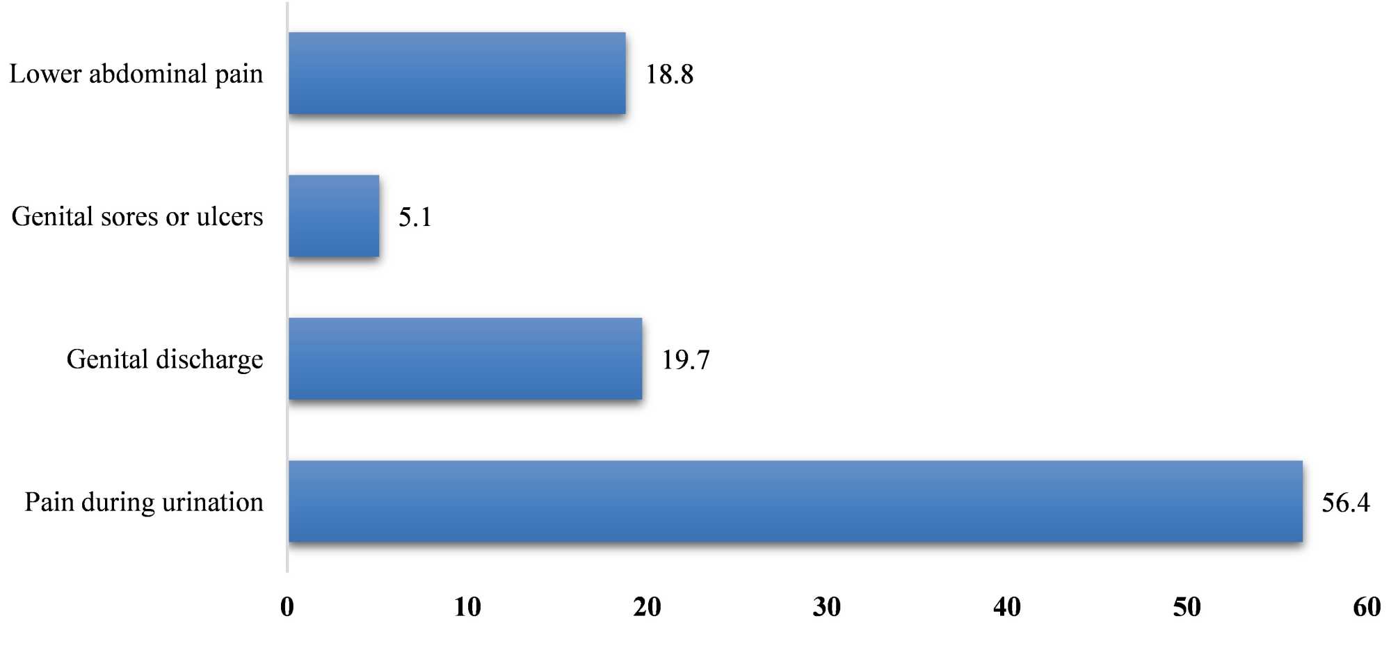The socio demographic characteristics of the 117 study participants reflect a population largely composed of young, married, and educated individuals, with a mean age of 27.6 years. This finding aligns with similar demographic distributions seen in STI related studies conducted across sub-Saharan Africa, which often report a concentration of cases among young adults aged 20 - 30 years [19] [20]. The dominance of females (57.3%) mirrors observations in similar studies where females tend to be more represented in health-related research, possibly due to higher healthcare seeking behavior [21].