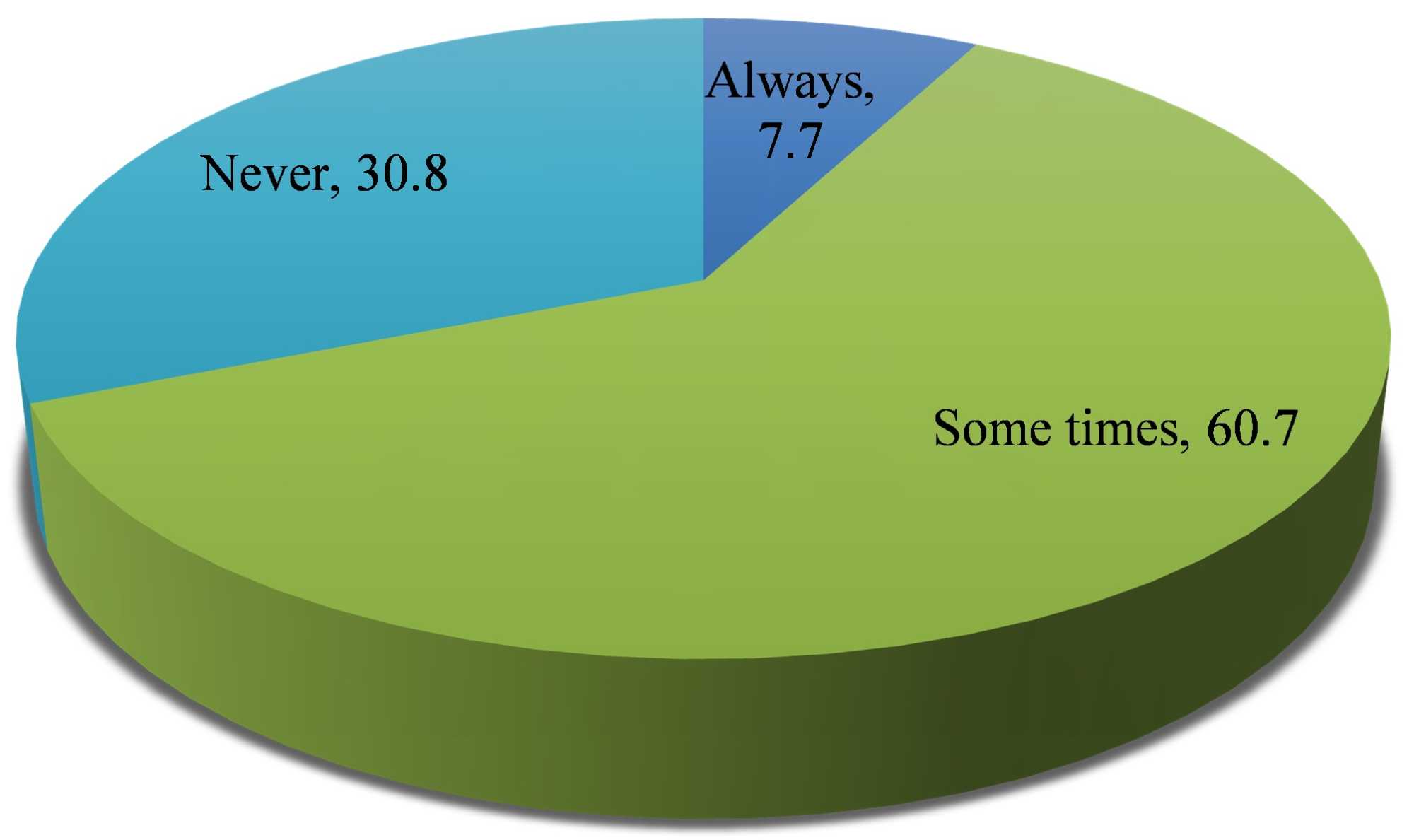 Up to 75.2% (n = 88) reported to have one sexual partner while 12.8% reported to have 2 sexual partners. In this study, only 7.7% of respondents reported to always use condoms during sexual intercourse. 31.0% reported never using condoms during sexual intercourse as shown in Figure 6 below.