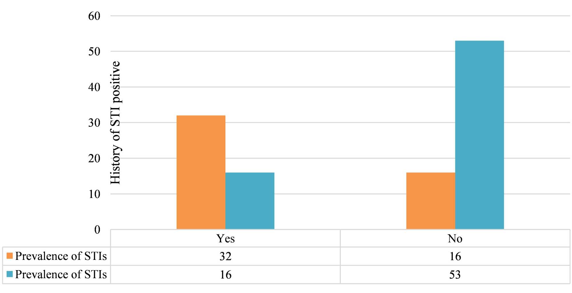 The association between STI prevalence and sex was significant (p = 0.03), with females showing a higher positivity rate than males. This is supported by global evidence indicating that women are biologically more susceptible to STI due to larger mucosal surfaces exposed during intercourse and social barriers limiting access to care [29] [30]. Moreover, cultural gender dynamics often reduce women’s negotiation power in sexual relationships, increasing their vulnerability [31].