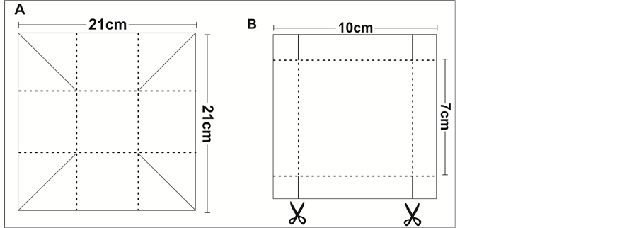 Figure 1. Diagram to guide the making of Box (A) and its cover (B) used to address the square concepts and fractions.