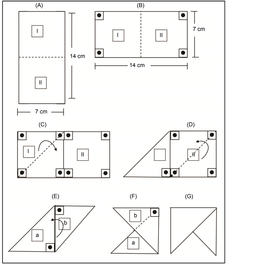 Figure 3. Origami diagram of small flag of St. John party showing one rectangle two squares (part I and II; (A)-(C));. (D) Trapeze; (E) Parallelogram; (F) Figure Concove; (G) The small flag of St. John party.