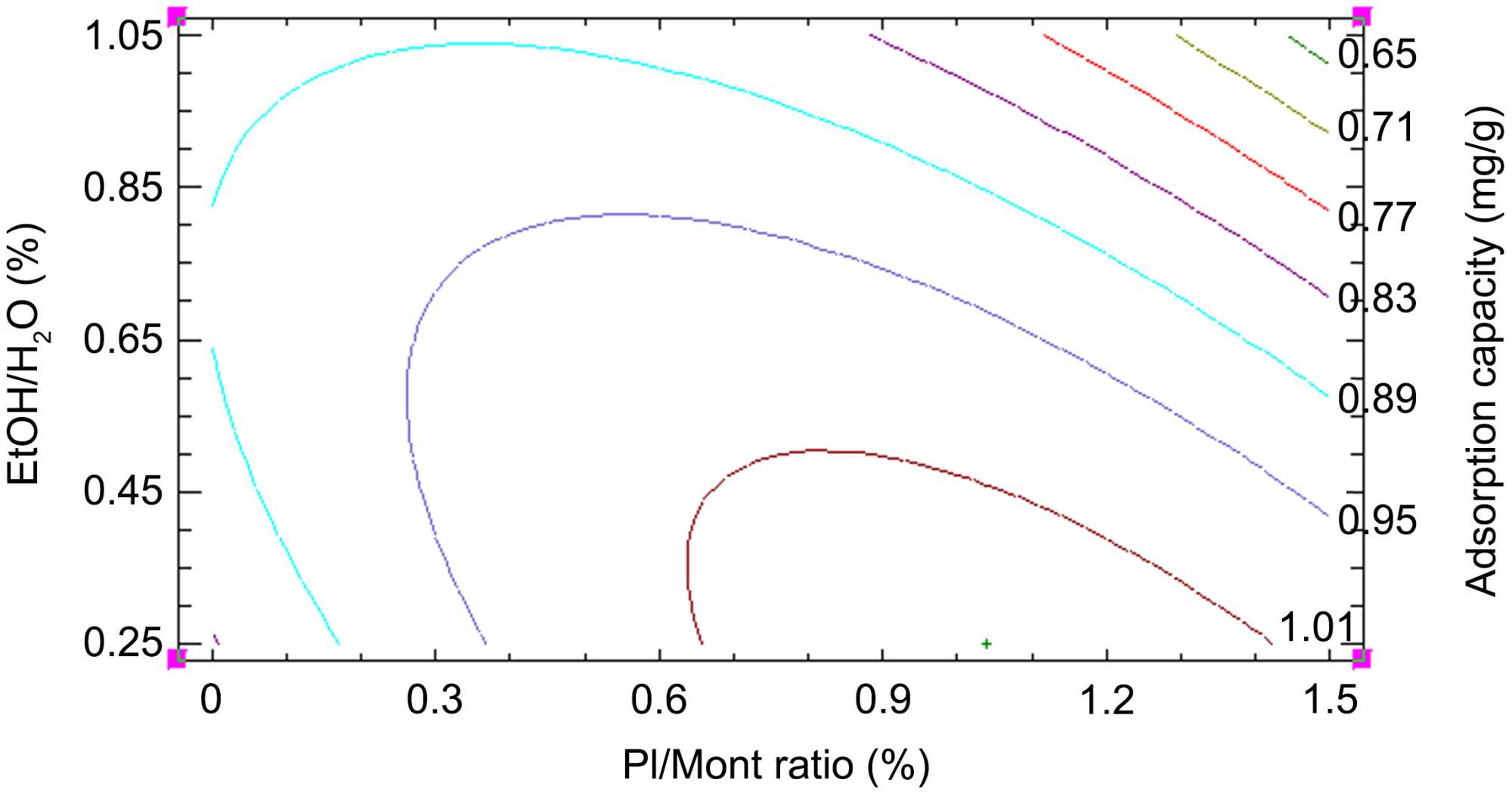 According to Figure 1, the new adsorbent material (PL-Mont) showing the best adsorption capacity is obtained with the lowest EtOH/H2O ratio and a high Pl/Mont ratio (EtOH/H2O ratio of 0.25% and phospholipid/montmorillonite ratio =1.00%). Chemically, modification of montmorillonite by phospholipids molecules is performed in a more polar medium with a high Pl/Mont ratio.