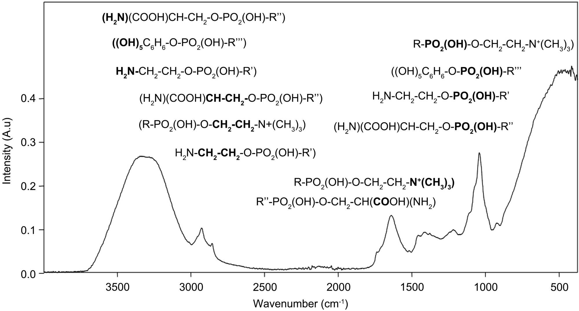 Figure 2. Infrared spectrum of phospholipids. With: R = C35H66O4, R’ = C38H73O4, R’’ = C41H69O4, R’’’ = C41H75O4.