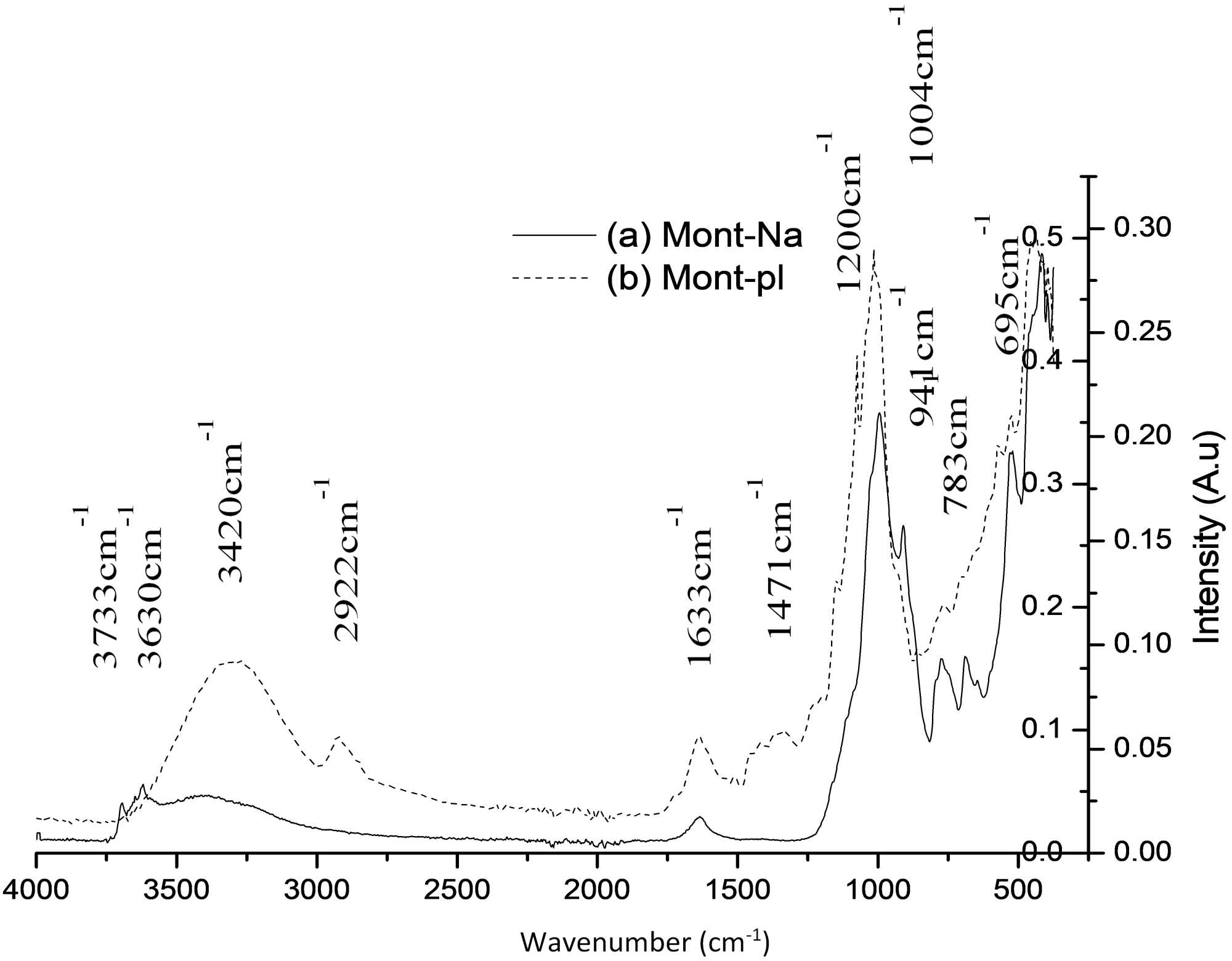 Spectra of Mont-Na and Mont-pl spectra are presented in Figure 3. The modified montmorillonite Figure 3(b) compared with the Na- montmorillonite, the modified montmorillonite has presented many new peaks initially non-existent in Na-Mont however present in phospholipids spectra (Figure 2). FTIR spectrum of Pl-Mont show some important picks around 3500 cm−1 which are particularly well observable corresponding to -NH2 group present in some phospholipids molecules. FTIR spectrum of phospholipid-montmorillonite also present a lighter shoulder at 3420 cm−1 as in phospholipids spectrum attribute to corresponding to -CHOH alcohol present phosphatidylinositol. An intense pic can be observed at 2922 cm−1 which is attributed to the asymmetric stretching vibration of -CH3 and symmetric stretching vibration of -CH2 respectively [11] [16], confirmed the new organic structure, character and property of Pl-Mont. The Mont-Pl also presented a deformation band at 1471 cm−1 corresponding to ammonium salts due to (CH3)3N+-corresponding to the phosphatidylcholine ammonium group [11]. The presence of phospholipid in the montmorillonite is also indicated by the appearance of the vibrations of -PO2 and -OH bonds to the phosphate between 1028 and 1300 cm−1, centered at around 1200 cm−1 [10] [11].