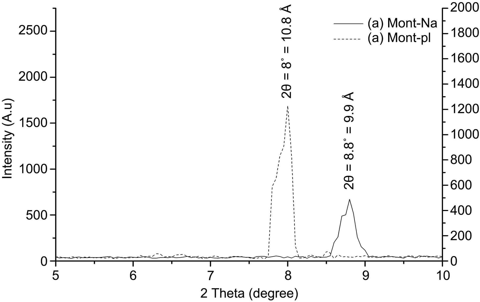 X-ray diffraction patterns of the Na-montmorillonite and modified montmorillonite displayed in Figure 4. The Mont-Na exhibits a reflection at 2θ = 8.8˚ corresponding to the interlayer space d001 value of 9.9 Å. From the XRD analysis, the montmorillonite has shown modification of the space sheet after treatment with natural phospholipids extracted from Glycine max cakes, as it’s can be saw on the patters by a lighter displacement of specifics picks from 2θ = 8.8˚ to 2θ = 8˚ corresponding to the interlayer space d001 value of 9.9 Å to 10.8 Å which indicates an intercalation of this montmorillonite interlayer space during the treatment by phospholipids molecules [11].