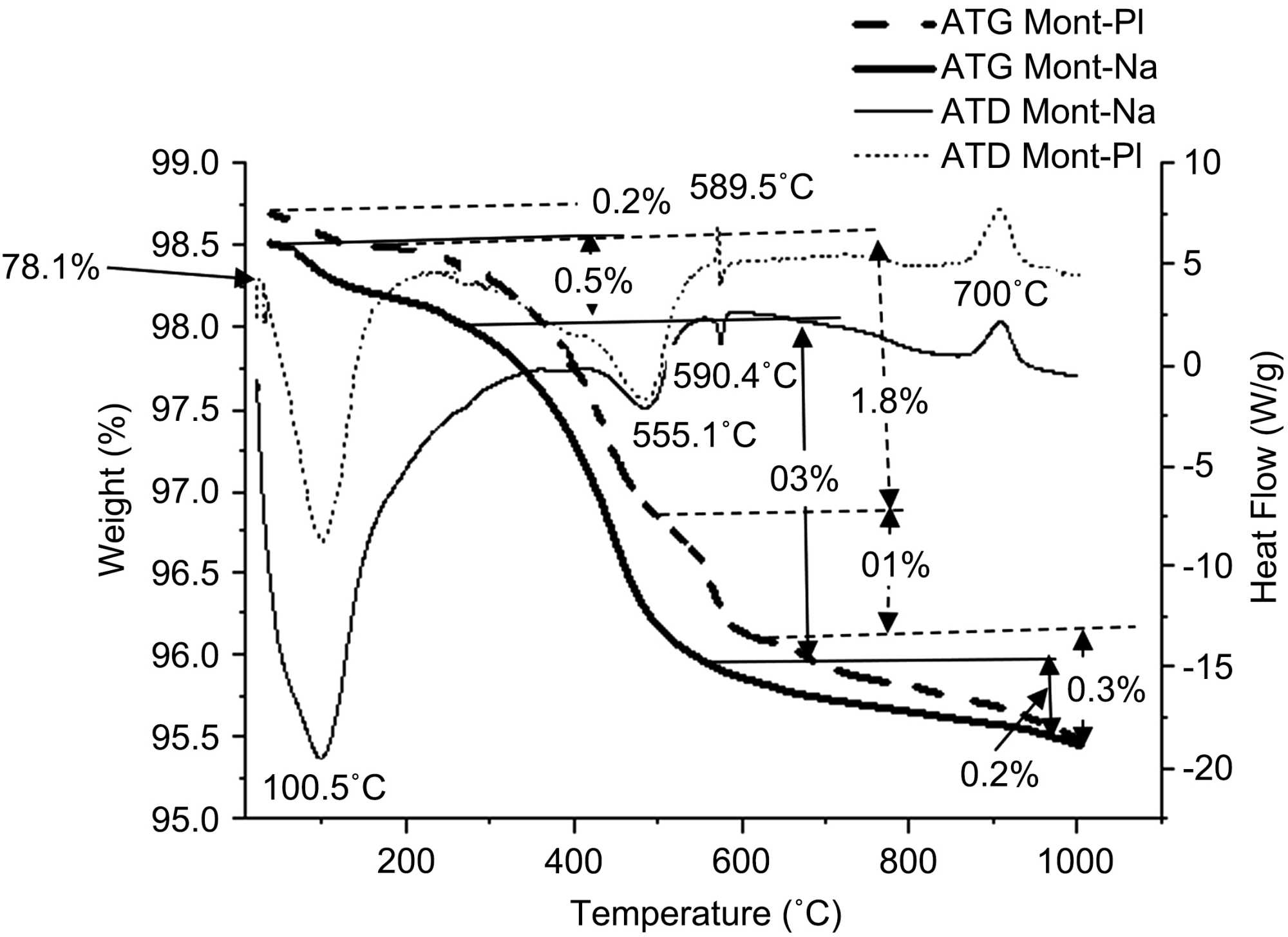Beyong 600˚C, the homosodic and modified montmorillonite record 0.2 and 0.3% of mass loss respectively corresponds to the exothermic pic visible on the TD curves of the two montmorillonites (900˚C). This is attributed to the deshydroxylation of Al-OH and Si-OH groups, which is occurring leading to a structural reorganization or recrystallization [10] [11] [15].