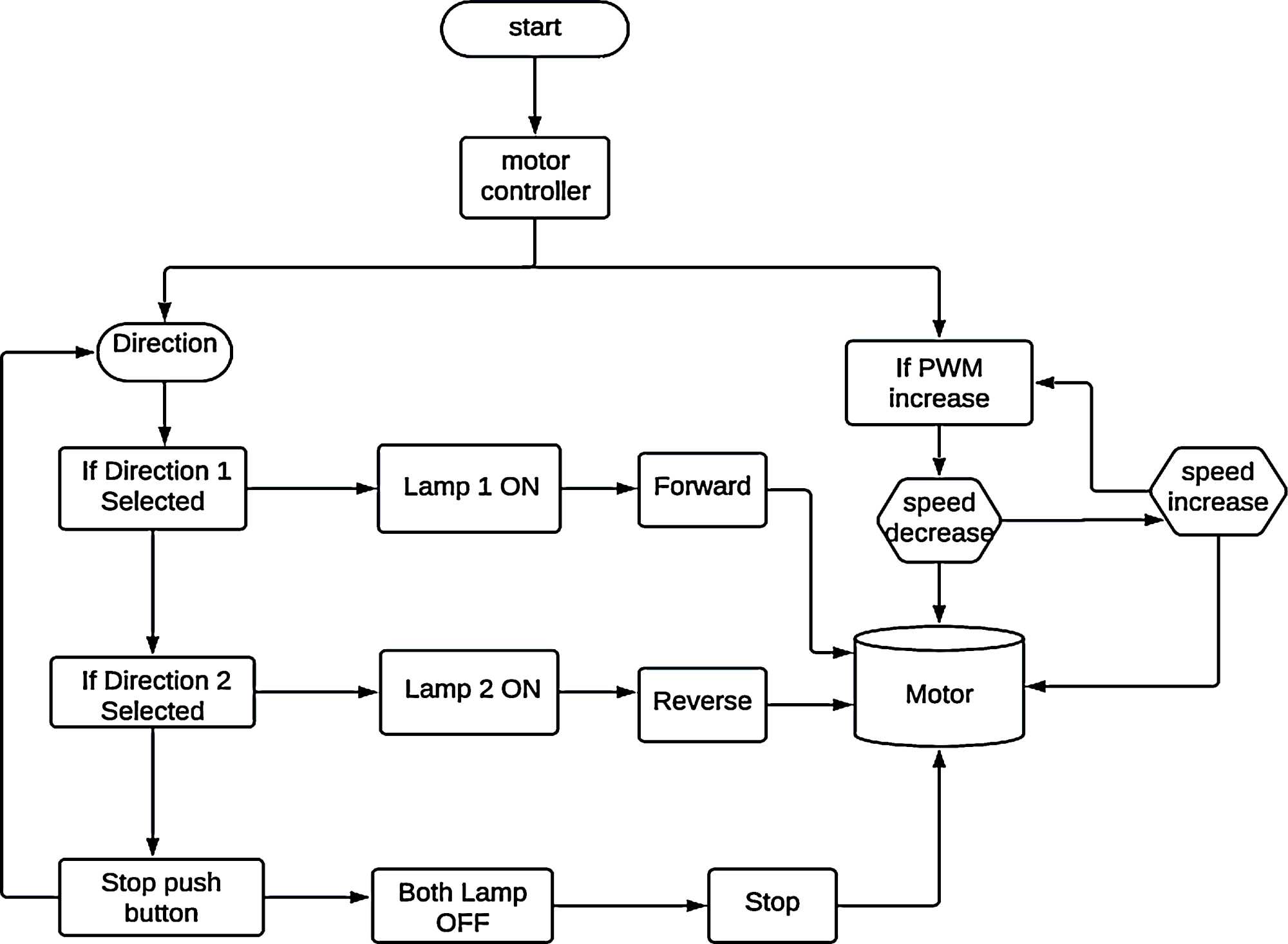 For the software implementation, Arduino IDE is used to program the Arduino Uno microcontroller in a high-level language called “C.”. The microcontroller acts as the brain of the whole DC motor direction and speed control system. An algorithm has to be created to make the microcontroller read the input and respond accordingly. Therefore, the algorithm is established and represented by a flowchart in Figure 1. This flowchart is then translated into the C programming language and compiled into hexadecimal format using the Arduino IDE compiler for the Arduino software development tool. It sends to and receives ASCII characters (alphabets) from the microcontroller. This topic shows how to control DC motor rotation direction and speed using an Arduino microcontroller and L293D motor driver chip. A pot is used to control motor speed, and two switches are used to control rotation direction.