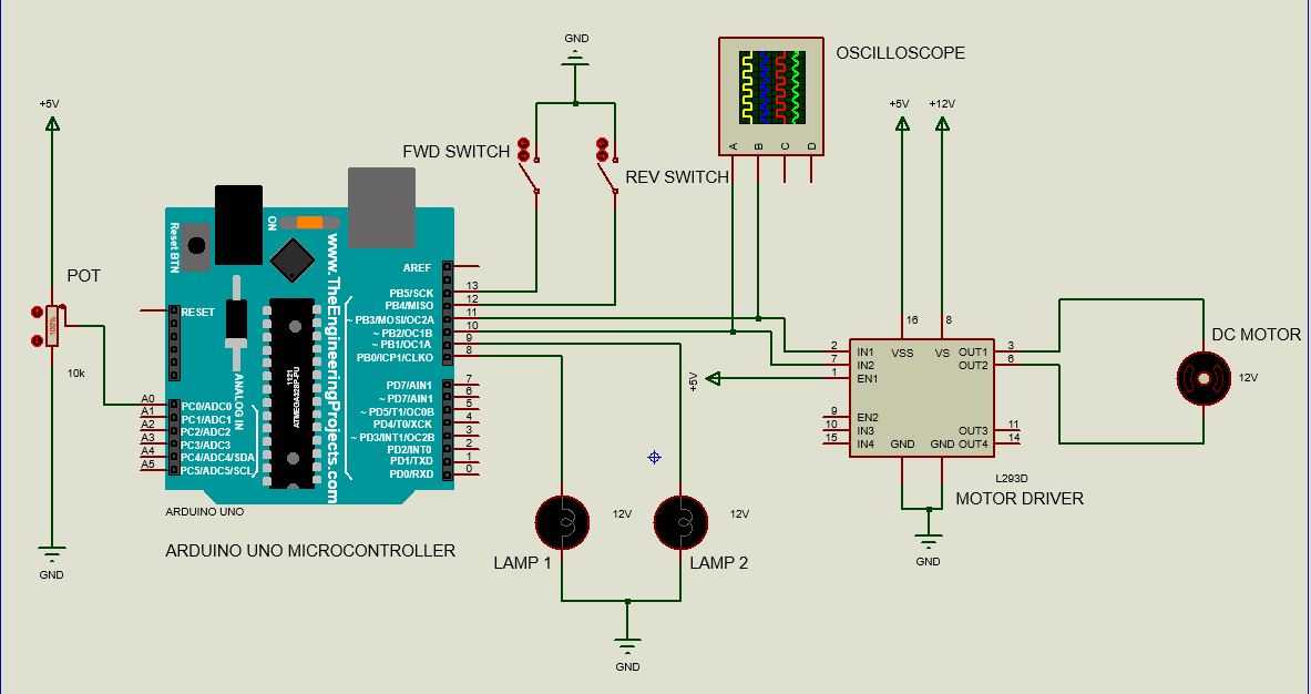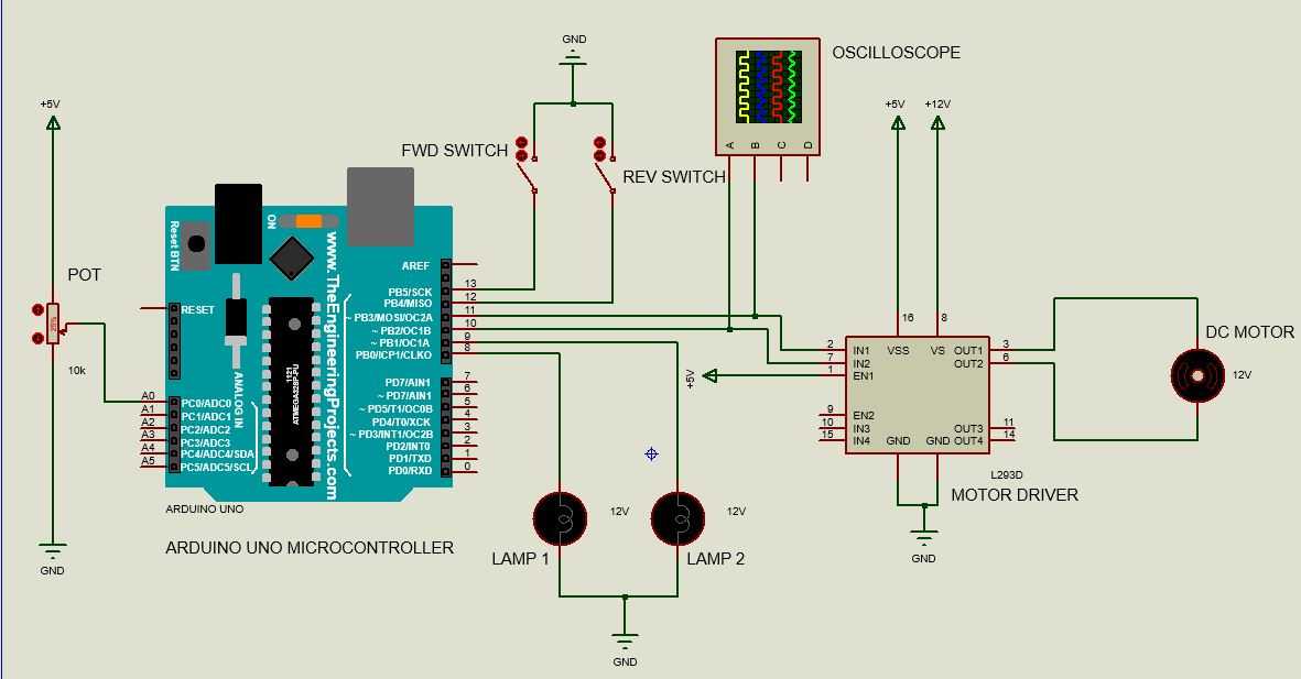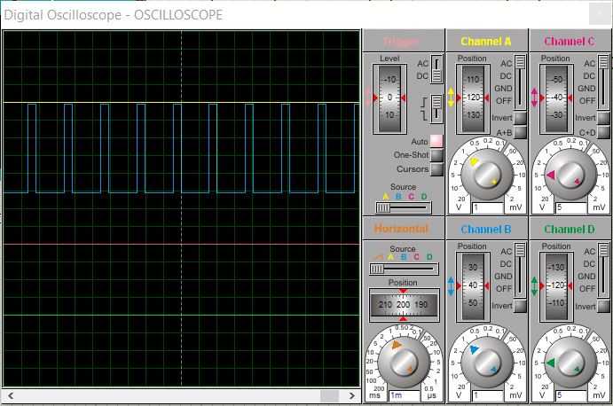 Simulation of the proposed circuit using ISIS Proteus for testing. This simulation uses a microcontroller generating PWM signals to control the speed of a motor. The PWM waves generated by the microcontroller can be seen below when 25% of the total resistance is inserted into the circuit, the PWM waves generated by the microcontroller are observed as follows: