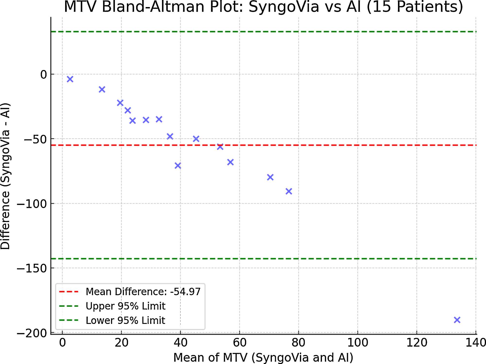 Figure 3. MTV Bland-Altman plot: SyngoVia vs AI.