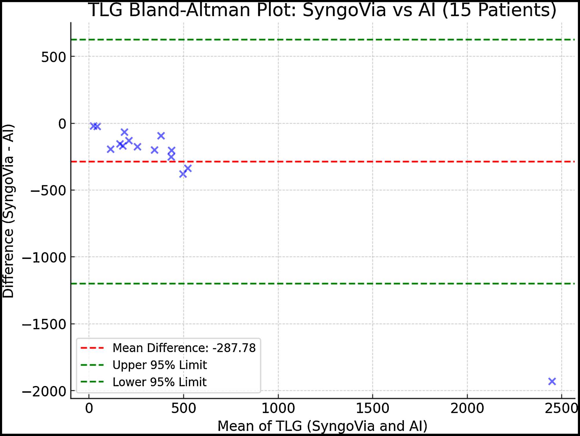Figure 4. TLG Bland-Altman plot: SyngoVia vs AI.