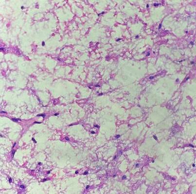 Figure 6. Microscopic appearance of the lesion showing stellate and spindle-shaped cells in a myxoid matrix (original magnification × 40).