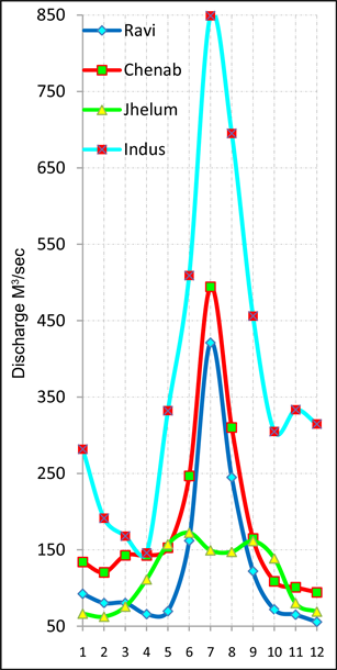 With the construction of a large dam on this river at Mangla and its storage activity in July, pre-storage preparatory release in June and post storage irrigation needs directed flow release thereafter, thus its flow downstream of Mangla has changed its annual natural flow pattern and made it somewhat smooth well distributed among the needy 6 months (Figure 3). In the monsoons season with the heavy rains fall particularly that of July and August, flow in form of large floods is handled by storage and irrigation needs are much reduced due to local rains with yet controlling opportunity due to large storage capacity, that is why there is controlled depression in downstream flow graph (Figure 3, Figure 6)