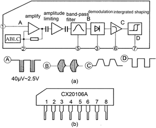 A waveform converting circuit is necessary because the received signal is an AC sinusoidal signal while the input of MCU must be a pulse signal. In this situation, The CX20106A [8] is an infrared receiver dedicated chip, commonly used in television infrared remote control. Its carrier frequency is 38 KHZ which is more similar to 40 KHZ. So, the CX20106A should be a center of the receiving circuit.