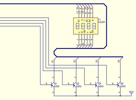 The common anode seven-segment LED will be used in this circuit and controlled by the MCU. The PNP transistor drive the LEDs, (8550 is used in this design). The drive capability of the I/O port is very small and P0 should be pull-up by the external resistor to increase drive capacity. There is one thing should be noticed, when the voltage level is low, it possibly burn microcontroller due to the current flows into the I/O is too large. So the pull-up resistor is generally 600 Ω to 1000 Ω. The experiments show that the digital tube is bright by using this range of value. Its schematic diagram is shown in Figure 7.