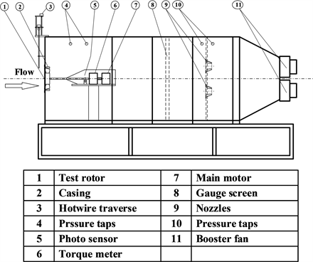 The experiment was carried out using a performance test wind tunnel with a square cross section of 880 mm. Figure 1 shows the schematic view of test rig and its component list. The flow direction is left to right in Figure 1. As the test rig didn’t have the throttle to regulate the flowrate, the flowrate was set up by changing the power of booster fan. At the fan test, the pressure-rise in the chamber box, the shaft power and the pressure difference at nozzle section were measured for each flowrate condition. The rotor blade location at hotwire survey was detected by use of photo sensor mounted on motor shaft. Figure 2 shows the outline of the test rotor. The rotor has 5 blades, its tip diameter is approximately 180mm, and the hub-to-tip ratio is 0.5. The rotating direction is clockwise from the front view direction.
