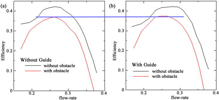 Figure 5. Effect of obstacle on efficiency in case of R15. (a) Without guide vanes; (b) With guide vanes.