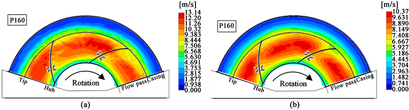 Figure 8. Contour maps of tangential-radial resultant velocity at fan outlet in case of R15 with obstacle. (a) Without guide vanes; (b) With guide vanes.