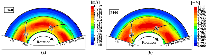 flowrate measured is near the best efficiency point (BEP). Figure 7 is the same contour map, but the results are obtained when there is an obstacle upstream of the fan. In both cases, the range shown in the figure is two pitches of the blade, the inner small arc indicates the hub, and the arc in the figure indicates the tip location, respectively. The solid line connecting the arcs of the hub and tip indicates the blade trailing edge, and the symbols PS and SS mean “Pressure Surface” and “Suction Surface”, respectively. The rotor rotating direction is clockwise as shown in the figure. The velocity magnitude is represented by a color distribution and its legend is on the right side of each figure.