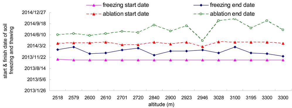1) The soil freezing rate showed a trend of fluctuation increases with rising altitude, while the soil’s thawing rate displayed the opposite trend. The soil’s freezing-thawing variation degree presented a trend of fluctuation increase with rising altitude. The ending time of the soil freezing showed a trend of fluctuation in advance with the rising altitude, while the trend of the thawing was found to be the opposite.
