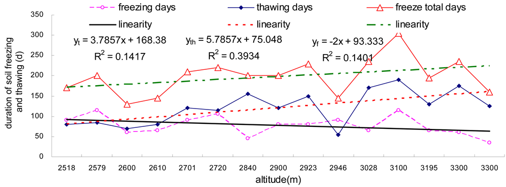 The variation coefficient was an indicator to study the variation degree of the freezing-thawing process of soil (Table 2). Within the soil scope with a depth of 150 cm, the soil freezing variation was sequenced from smallest to largest as follows: the moss spruce forest with an altitude of 2518 m < shrub grassland with an altitude of 2701 m < shrub grassland with an altitude of 2579 m < grass shrub forest with an altitude of 2600 m < moss spruce forest with an altitude of 2610 m < grass shrub forest with an altitude of 2900 m < scrub spruce forest with an altitude of 3195 m < moss spruce forest with an altitude of 2720 m < moss spruce forest with an altitude of 2923 m < shrub spruce forest with an altitude of 3100 m < grass spruce forest with an altitude of 2840 m < moss spruce forest with an altitude of 3028 m < subalpine shrub forest with an altitude of 3300 m < sunny slope grassland with an altitude of 2946 m < shrub spruce forest with an altitude of 3300 m, averaged at 0.4. The soil’s thawing change was sequenced from smallest to largest as follows: the shrub grassland with an altitude of 2579 m < shrub grassland with an altitude of 2701 m < sunny slope grassland with an altitude of 2946 m < grass shrub forest with an altitude of 2900 m < moss spruce forest with an altitude of 2518 m < grass shrub forest with an altitude of 2600 m < subalpine forest with an altitude of 3300 m < moss spruce forest with an altitude of 3300 m < moss spruce forest with an altitude of 2720 m < shrub spruce forest with an altitude of 3100 m < shrub spruce forest with an altitude of 3300 m < moss spruce forest with an altitude of 2923 m < moss spruce forest with an altitude of 3028 m < grass spruce forest with an altitude of 2840 m < shrub spruce forest with an altitude of 3195 m, averaged at 1.2.