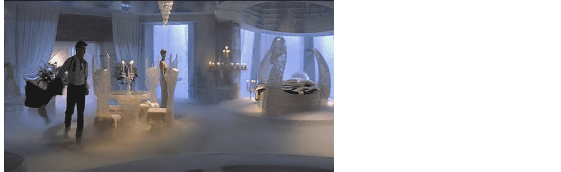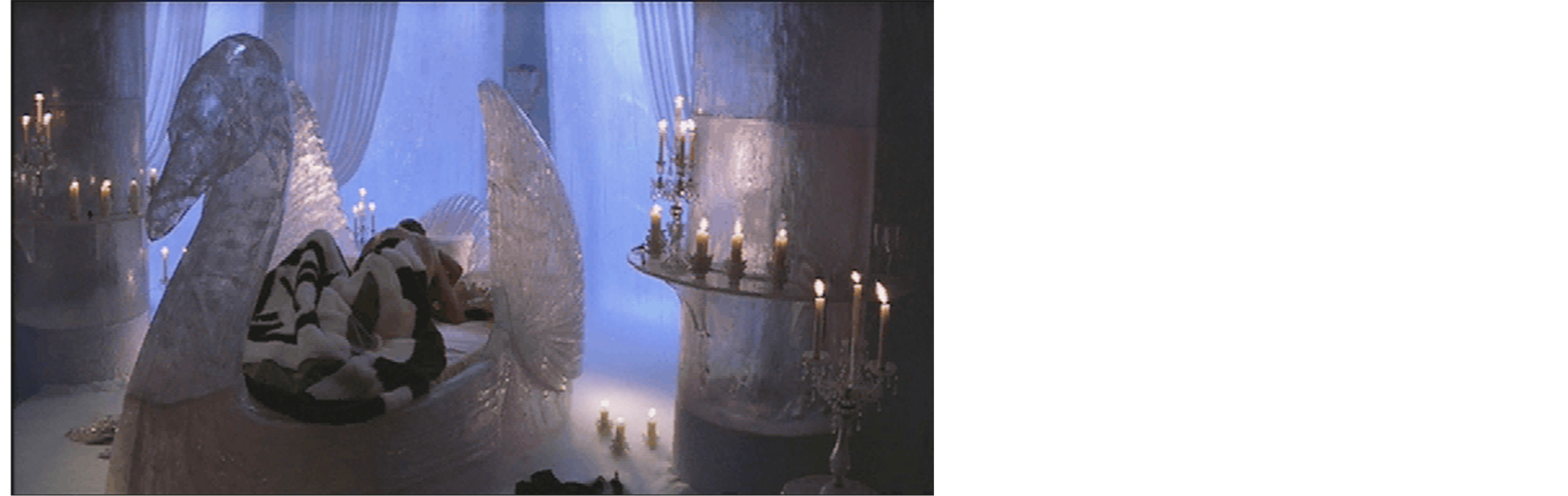 A more recent Bond girl, Miranda Frost forms a rather complex relationship with 007 in Die Another Day (2002); this complexity is defined as two secret agents attempt to seduce each other at the same time (Figure 5). A memorable scene is created when their attempts are proven successful, and they spend a night together in an ice castle. What makes this a mutual seduction? They have agreed to keep up the “charade of being lovers” with the aid of a room equipped with a swan-shaped bed of ice, fur blankets, pools of light, fog, and a few sentimental candles. They enter the room at the same time, which is important in a seduction scene because it implies that one person does not do the tempting, and one person does not have to surrender (Figure 6). Neither individual has the chance to construct a set-up in the bedroom, where they delicately undress themselves—not each other— and almost immediately begin their charades in the inimitable swan bed. Love, light, intuition and grace are the attributes usually connected to the image of a swan, but this seduction is not usual. The scene is better represented when we use the symbolism in alchemy, where the swan is neither masculine nor feminine; rather, the swan stands for “a marriage of the opposites”. Appropriately, the swan bed room is filled with opposites: black and white, fire and ice, rough and smooth, warm and cold. This architectural clashing of elements is reflected in the intentions of these two “lovers”, each trying to extract information from the other while keeping his or her identity hidden (Figure 7).