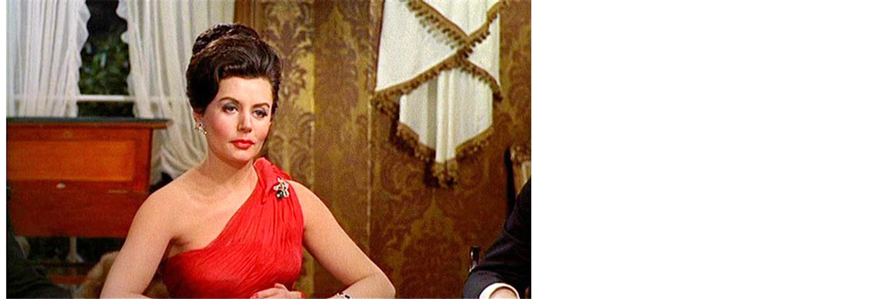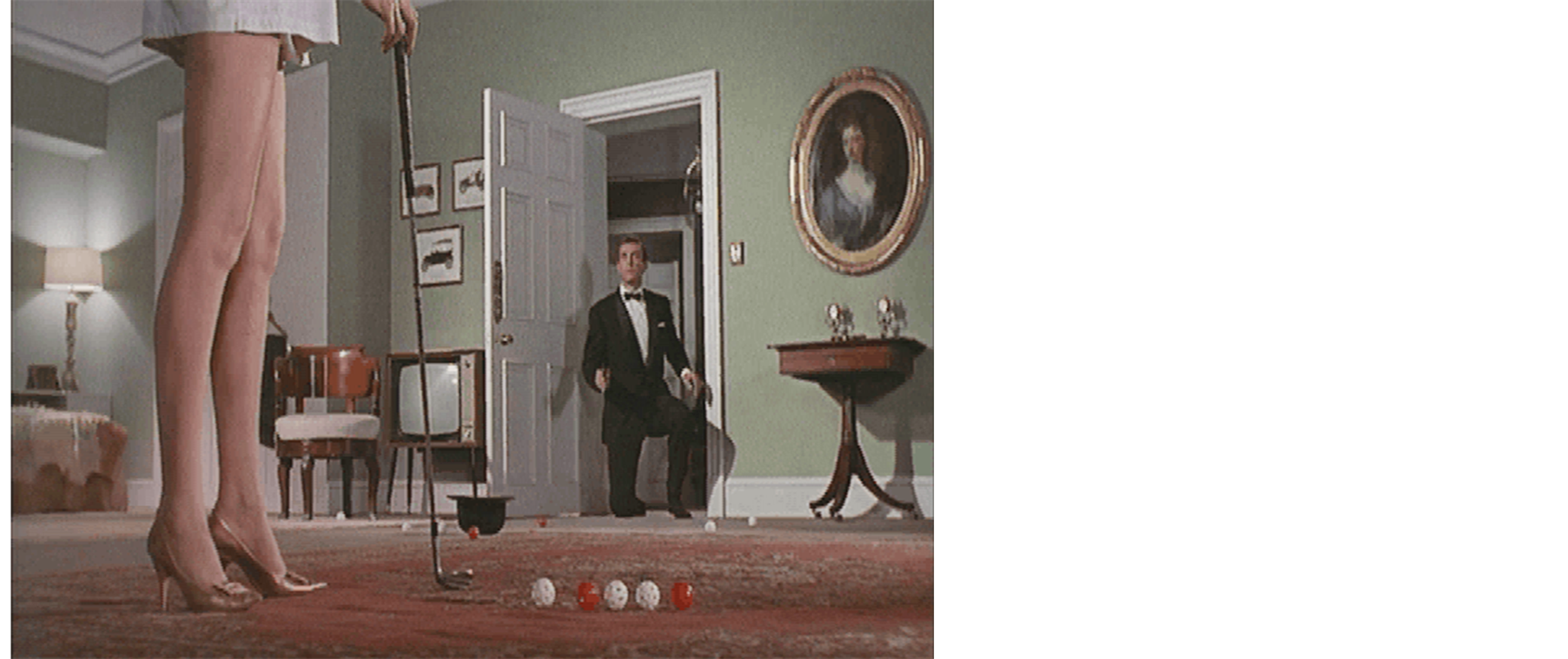 Sylvia Trench, being the first Bond girl to ever appear onscreen (in fact, audiences meet Sylvia before being introduced to James Bond), is a classic example of a Bond girl (Figure 1). As the girl who surprises Bond at his apartment by playing “sexy golf,” Dr. No (1962) introduces her as Bond is shown walking in on Sylvia, who is dressed only in a man’s long-sleeved shirt (Figure 2).