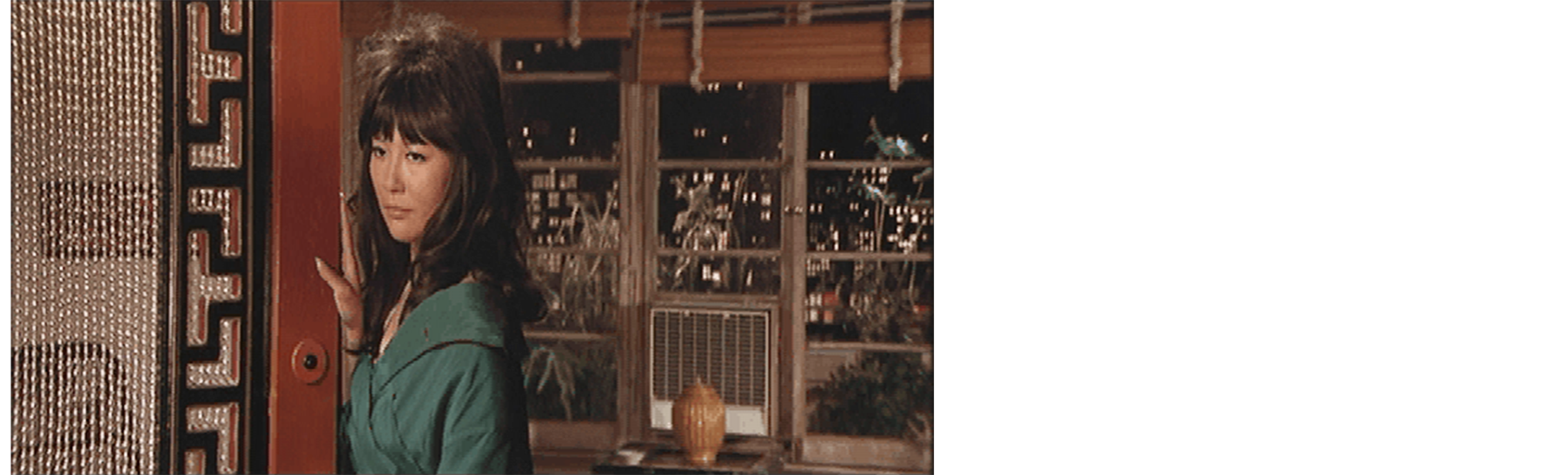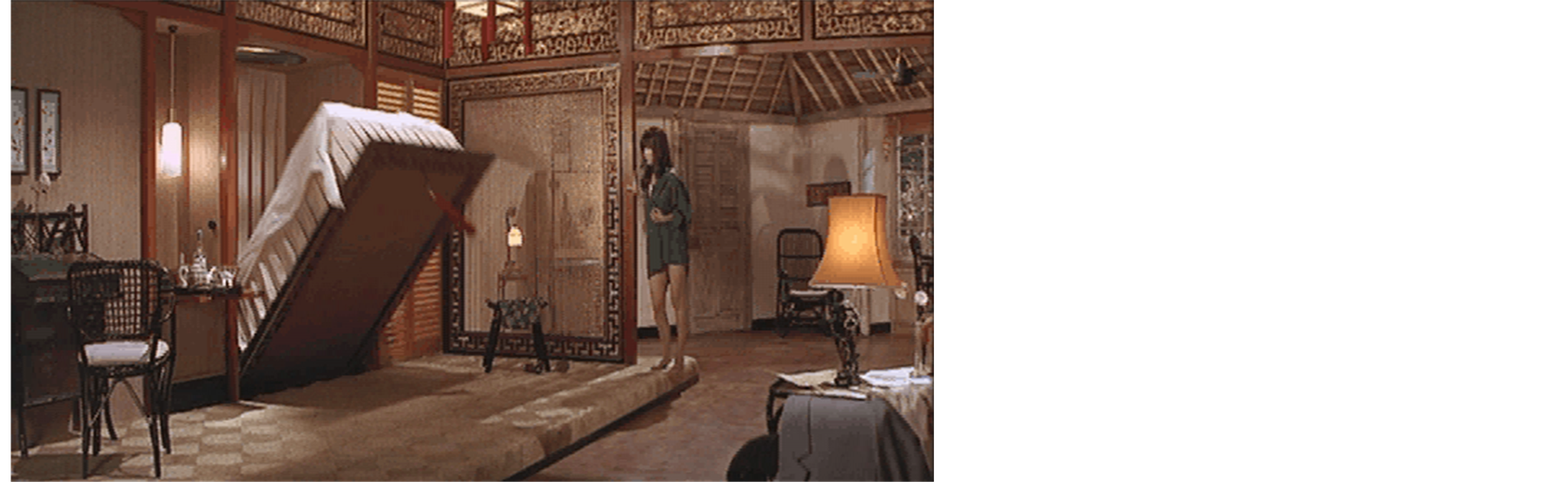 An excellent case of this reveal occurs in You Only Live Twice (1967), where Ling aids in the staging of Bond’s death. How did Bond allow this to happen? A probable answer is that Ling gave him no choice, similar to Sylvia Trench’s set-up. The pre-credit sequence shows Bond and Ling in bed together sharing an intimate moment. The audience does not know how they end up in this situation, but from Ling’s over-confidence (which is another developing trait for Bond girls in control) one can assume that she has had more than a minor part in initiating the seduction. While in mid-conversation with Bond, she casually gets up, steps down from the platform elevating the bed and strolls over to a partition wall (Figure 3). By pressing a button on the end of this wall, she flips the bed into an upright position with Bond still in it: this creates the perfect opportunity for gunmen to enter the scene and murder the British agent. Of course, the audience is not alarmed. They assume their hero will soon return, as his so-called death occurs not five minutes into the film. More importantly, what they now realize is that the seduction scene took place because of covert intent, and what remains is a crime scene. The emergence of henchmen reveals that this crime is the result of collaboration, and although she is not the one shooting the gun, Ling is presumably the key accomplice to this attempted murder. Pivotal is her success in executing the task of getting Bond into bed.