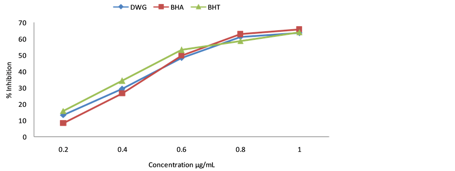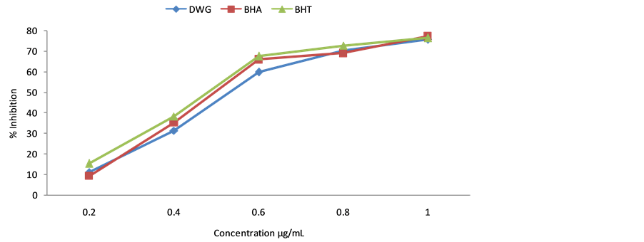 DPPH is a stable organic free radical that is dissolved in methanol and its purple colour shows maximum absorbance at 517 nm. When DPPH radicals encounter a proton-donating substance such as an antioxidant, the radicals would be scavenged and the colour from the DPPH assay solution becomes light yellow resulting in a decrease in absorbance. It can accommodate many samples in a short period and is sensitive enough to detect active ingredients at low concentrations [28] . Thus, the DPPH radicals have been widely used to determine the free radical scavenging ability of various samples. In this assay, results are expressed as the ratio percentage of the absorbance decrease of DPPH radical solution in the presence of extract at 517 nm to the absorbance of DPPH radical solution at the same wavelength. Figure 1 shows the results of scavenging DPPH radical ability of DWG at various concentrations and compared with those of BHA and BHT. DWG showed DPPH scavenging activities in a concentration dependent manner. The antioxidative activity of DWG was close to that of synthetic antioxidants BHA and BHT. A similar trend was observed in a study of the antioxidant activity of the field horsetail (tsukushi) Equisetum arvense L. extracts [19] . The EC50 (meaning the concentration that causes a decrease in the initial DPPH concentration by 50%) is a parameter widely used to measure the antiradical efficiency, which was obtained by interpolation from linear regression analysis. A lower EC50 value is associated with a higher radical scavenging activity. The result showed that DWG is a free radical inhibitor, as well as a primary antioxidant that reacts with free radicals, which may limit the occurrence of free radical damage in human body.
