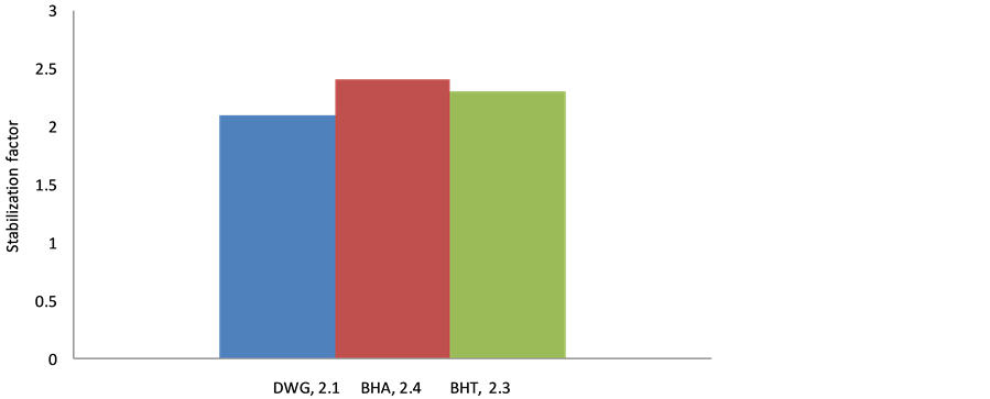 The oxidative stability of oils are affected by many factors, including fatty acid composition, concentration and stability of antioxidants in the oil, and the presence of prooxidant compounds, such as free fatty acids, lipid peroxides, or prooxidant metals. The Rancimat method is an accelerated aging test (taking several hours to a day, depending on the oil and test temperature) used to establish the relative oxidative stability of oils, as measured by the induction time (called the oxidative stability index, OSI) for an oil to begin oxidizing under controlled temperature and air flow conditions. Rancimat results, due to the formation of secondary reaction products, showed a pattern in good agreement with that of ABTS and DPPH methods. As can be seen in Figure 3, stabilization factor of DWG extract was (2.1). Considering the results of all three assays, it may be anticipated that the extract of defatted wheat germ has antioxidant activity.