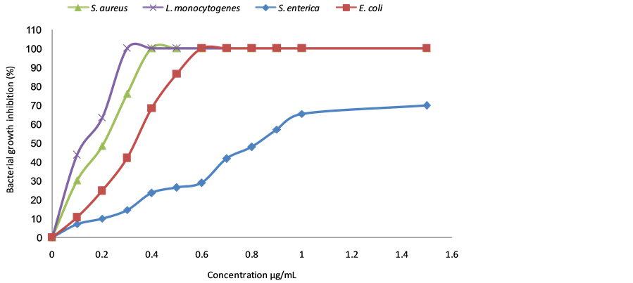 The antibacterial ability of defatted wheat germ was evaluated as natural antibacterial agents against certain bac- teria known to cause infection in humans. Staphylococcus aureus and Escherichia coli are of the major causes of hospital-acquired infections [31] . These organisms occur naturally in and on human body. The antibacterial activity of DWG extract at different concentrations in vitro test against Listeria monocytogenes, Staphylococcus aureus, Salmonella enterica and Escherichia coli bacteria were showed in Figure 4. The extract evidenced antibacterial activity, and showed different bacterial growth inhibition for each microorganism. According to the