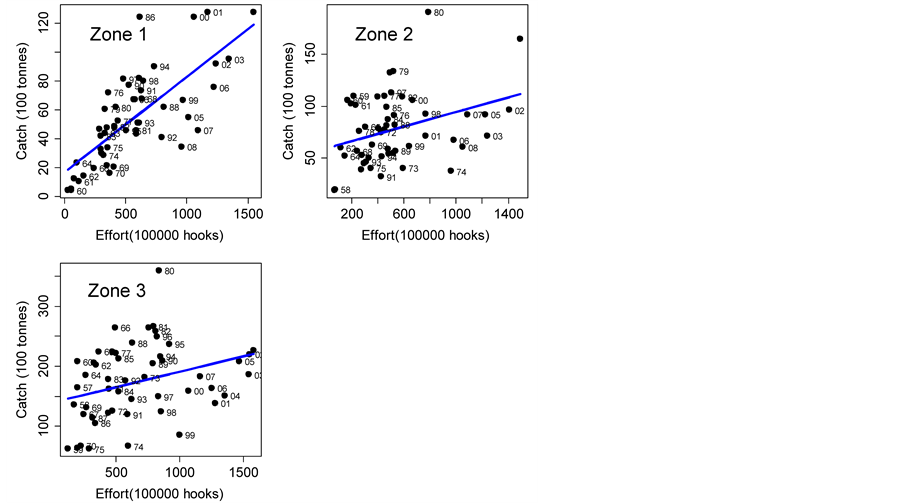 Figure 4. The relationship between the catch and effort for the yellowfin tuna (T. albacares) stock in Zone 1, Zone 2 and Zone 3 from 1957-2008. The determination coefficients are 0.745, 0.343 and 0.327 respectively.