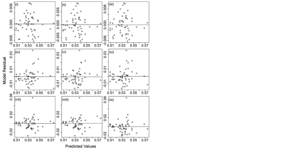 Collinearity tests did not show any significantly high correlations between any of the independent variables incorporated into the final models in Table 3. Homogeneity tests showed that all model residuals shown in Table 3 have a variance of <0.1 which fulfills the requirements of homogeneity where variance needs to be <4.00 for the least square estimators to be reliable [26] (Figure 6).