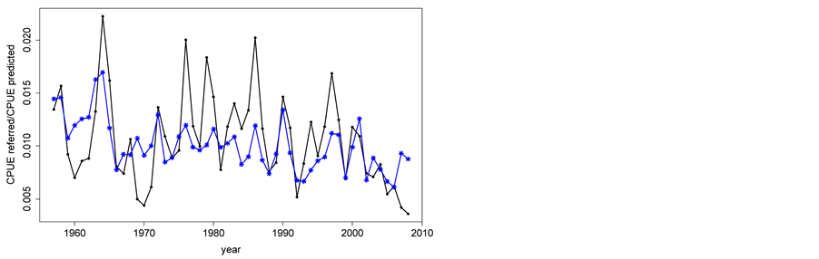 Figure 8. Graph showing the CPUE time series trajectory of the yellowfin tuna (T. albacares) stock in Zone 2 for the years 1957-2008. The referred CPUE is shown in black and the trajectory which resulted from model iv (Table 3) is shown in blue.